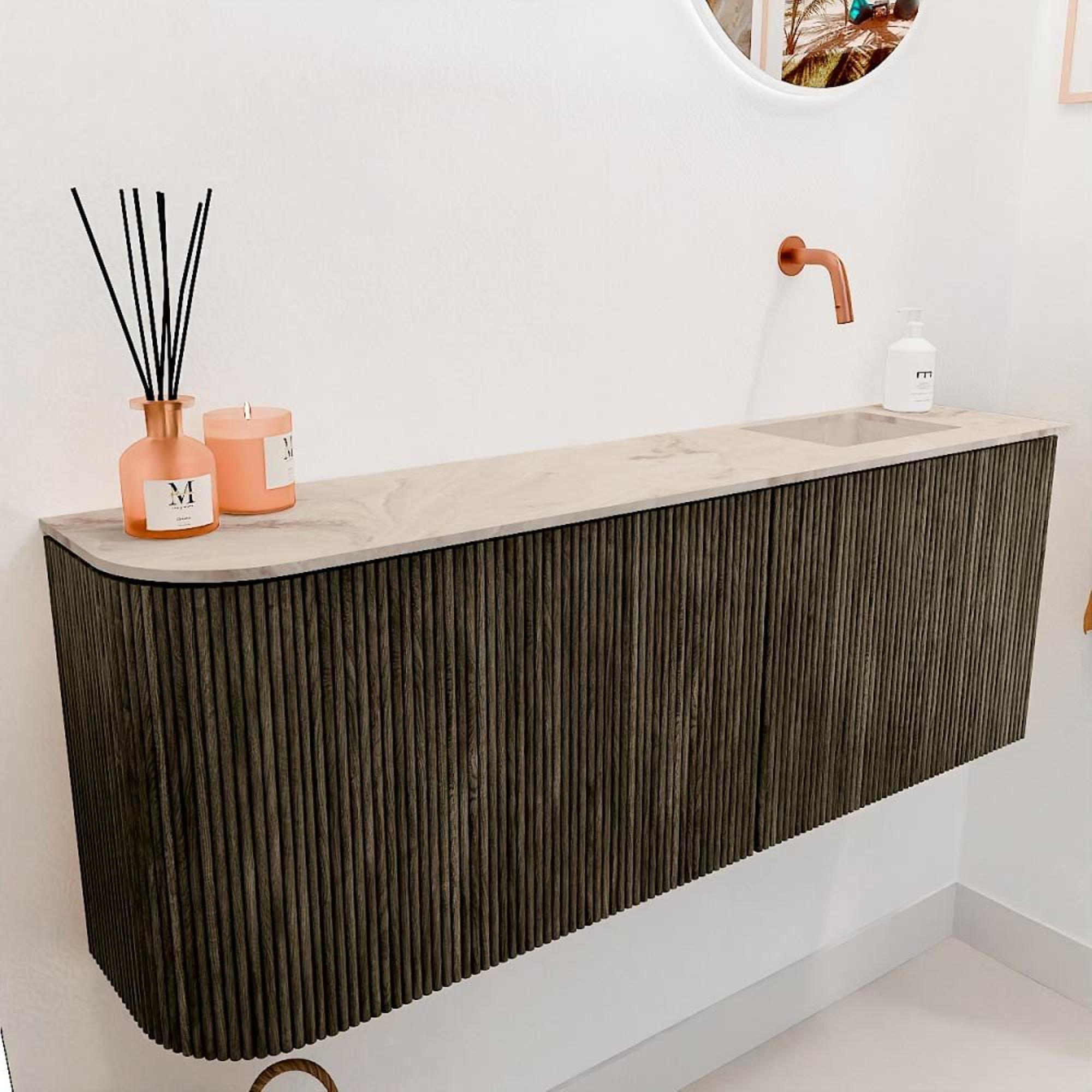 De combinatie van het warme Shadow-kleurige hout en de ronde vorm aan de linkerkant maakt dit meubel bijzonder elegant. Het ontwerp sluit naadloos aan bij moderne en klassieke badkamers, waardoor het een veelzijdige keuze is. Door de natuurlijke uitstraling van het eikenhout krijgt je badkamer een rustgevende en luxe sfeer. Dit meubel is niet zomaar functioneel, het is een statement van goede smaak en aandacht voor detail.