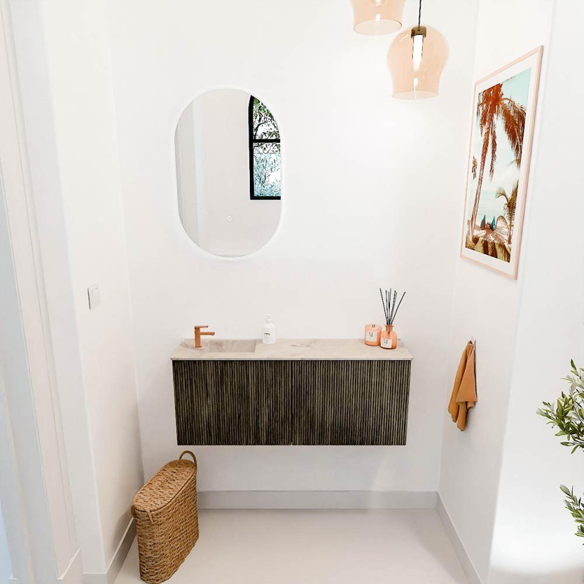 Het meubel valt direct op door het moderne design met verticale groeven die een chique en eigentijdse uitstraling geven. De combinatie van de kleur Shadow met de warme Frappe wastafel zorgt voor een subtiel contrast dat elke badkamer verrijkt. Door het strakke, minimalistische ontwerp past het meubel moeiteloos in diverse interieurstijlen, van modern tot klassiek. Zo creëer je een badkamer die niet alleen functioneel is, maar ook een echte blikvanger wordt. Met dit meubel kies je voor een tijdloos design dat jarenlang meegaat zonder uit de mode te raken.