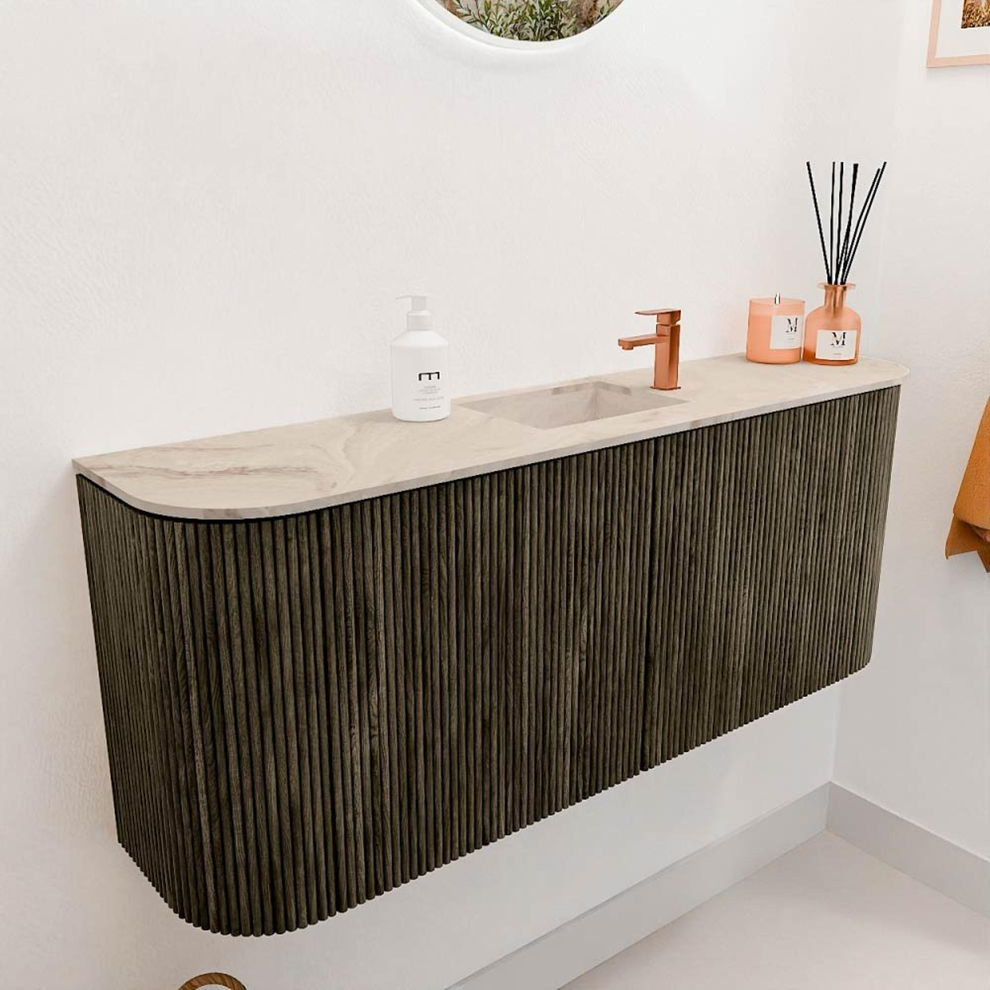 Het meubel valt direct op door zijn elegante uitstraling. De diepe Shadow kleur geeft een moderne en toch tijdloze sfeer aan je badkamer. De afgeronde randen aan beide zijden zorgen voor een zachte, uitnodigende look die het geheel verfijnt. Deze subtiele details maken het meubel tot een echte blikvanger, zonder te overheersen. Zo voeg je moeiteloos een vleugje luxe toe aan je badkamerinterieur, wat bijdraagt aan een gevoel van comfort en welzijn. De combinatie met de Frappe wastafel in een lichte, natuurlijke tint zorgt voor een mooi contrast en een frisse uitstraling.