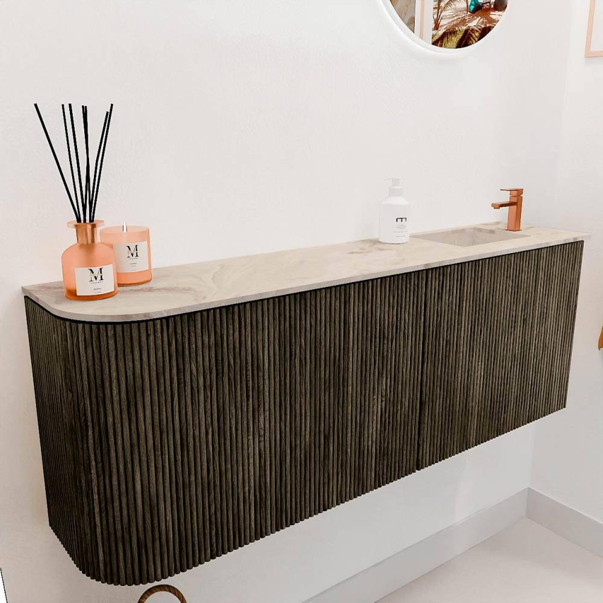 Het meubel valt direct op door zijn elegante ronding aan de linkerkant en de verticale groeven die het front sieren. Deze details geven het een moderne en toch tijdloze uitstraling die moeiteloos past in uiteenlopende badkamerstijlen. De kleur Shadow voegt een diepe, warme tint toe die rust en luxe uitstraalt. Door de combinatie met de Frappe-kleur van de wastafel ontstaat een subtiel contrast dat de aandacht trekt zonder te overheersen. Dit meubel is een echte blikvanger die jouw badkamer een exclusieve sfeer geeft, waardoor je elke dag met plezier begint en eindigt.