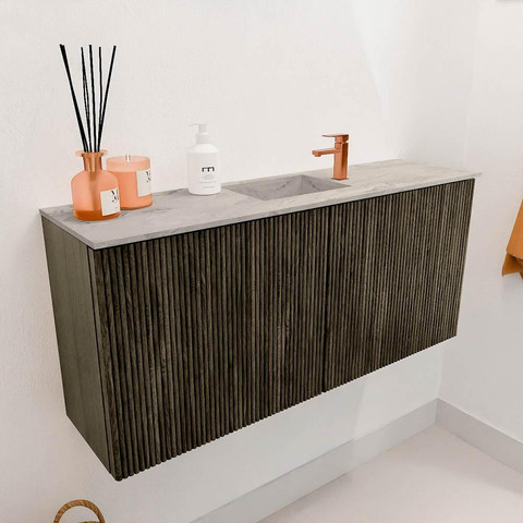 Het meubel valt direct op door zijn elegante uitstraling. De verticale groeven in het front geven het een verfijnde textuur die subtiel het licht vangt en diepte creëert. De kleur Shadow is een donkere, warme tint die rust en luxe uitstraalt, terwijl de wastafel in Glace een frisse, lichte touch toevoegt. Dit contrast maakt het meubel tot een echte blikvanger zonder te overheersen. Door het tijdloze design past het moeiteloos in zowel moderne als klassieke badkamers. Zo geniet je jarenlang van een badkamer die er verzorgd en stijlvol uitziet.