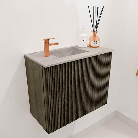 Het meubel valt direct op door het elegante design met verticale ribbelstructuur op de fronten, uitgevoerd in een rijke Shadow-kleur. Deze combinatie van puur eikenhout en een verfijnde afwerking zorgt voor een exclusieve uitstraling die moeiteloos past in zowel moderne als klassieke badkamers. De wastafel met links geplaatste kraangat is subtiel en praktisch, waardoor het meubel een strakke en verzorgde look behoudt. Zo voeg je een stijlvol accent toe dat jouw badkamer een unieke en persoonlijke touch geeft.