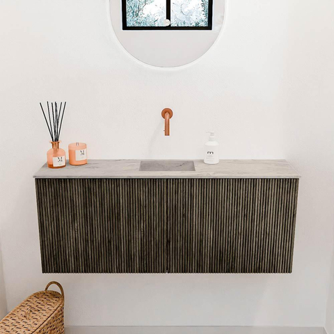 De combinatie van de diepe Shadow-kleur met de lichte Glace wastafel zorgt voor een tijdloze en elegante uitstraling. Het meubel is ontworpen met verticale groeven in het eikenhout, wat een subtiel maar onderscheidend detail toevoegt. Dit geeft niet alleen karakter, maar zorgt ook voor een natuurlijke en warme sfeer in je badkamer. Dankzij het strakke design en de hoogwaardige materialen past dit meubel moeiteloos in moderne en klassieke badkamers. Zo geniet je elke dag van een badkamer die er niet alleen mooi uitziet, maar ook jouw persoonlijke stijl weerspiegelt.