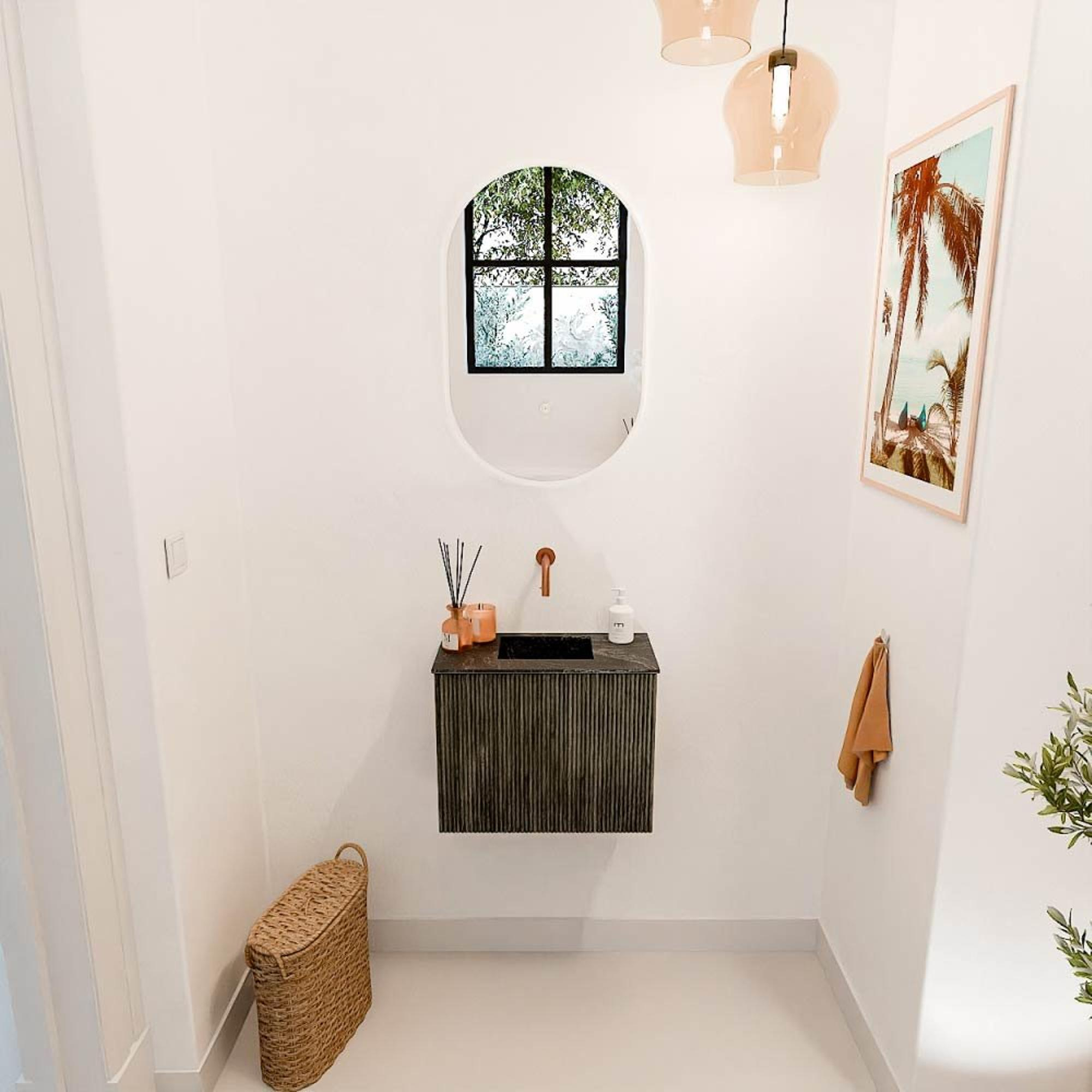 De combinatie van de diepe Shadow-kleur van het meubel met de warme Lava-wastafel creëert een tijdloos en stijlvol geheel. Het minimalistische design past moeiteloos in verschillende interieurstijlen, van modern tot industrieel. Door de subtiele afwerking en het strakke lijnenspel krijgt jouw toilet een luxe uitstraling zonder overdadig te zijn. Zo geniet je van een badkamermeubel dat niet alleen functioneel is, maar ook een echte eyecatcher vormt.