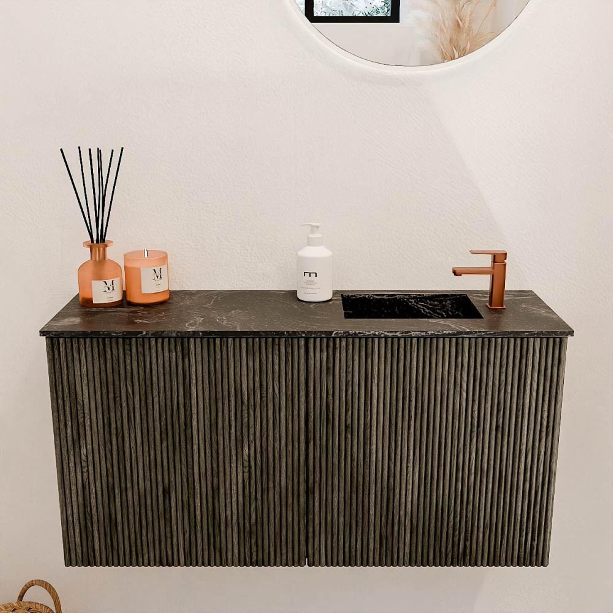 Dit meubel valt direct op door zijn elegante, verticale ribbelstructuur die een moderne en verfijnde uitstraling geeft. De combinatie van massief eikenhout aan de voorkant en eikenfineer aan de zijkanten zorgt voor een warme, natuurlijke look die je badkamer een luxe gevoel geeft. De kleur Shadow is subtiel en toch krachtig, waardoor het meubel een echte blikvanger wordt zonder te overheersen. Zo creëer je een stijlvolle basis die perfect aansluit bij jouw persoonlijke smaak en de rest van je badkamerinrichting.