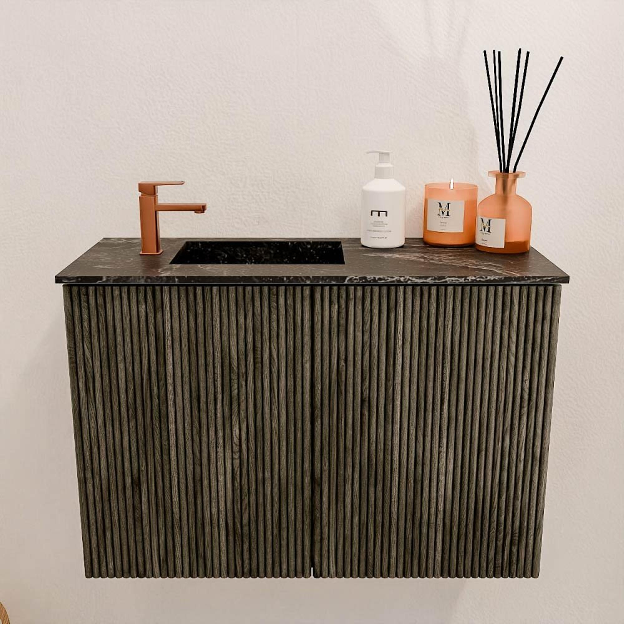 De combinatie van massief eikenhout en de diepe Shadow kleur geeft dit meubel een verfijnde en exclusieve uitstraling. De verticale groeven voegen een subtiel detail toe dat het design net dat beetje extra geeft. Dit zorgt ervoor dat het meubel niet alleen functioneel is, maar ook een echte blikvanger in je badkamer. Door de tijdloze stijl past het moeiteloos bij zowel moderne als klassieke interieurs. Zo geniet je jarenlang van een badkamer die er verzorgd en uitnodigend uitziet.