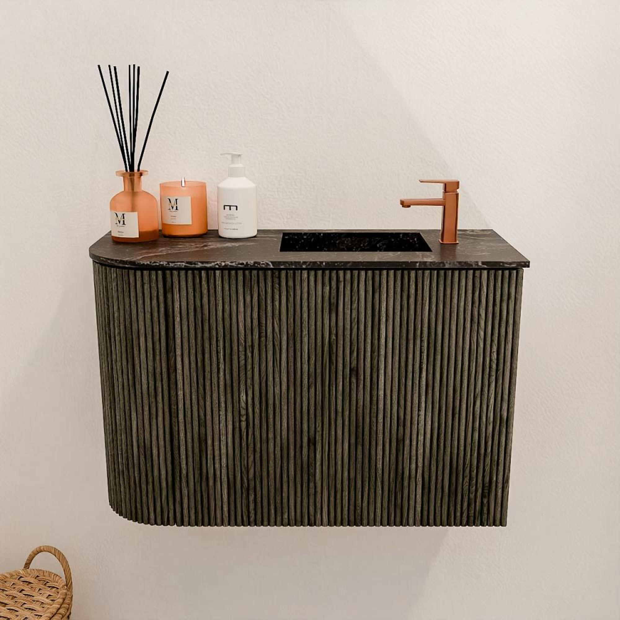 Dit meubel valt direct op door zijn verfijnde uitstraling. De combinatie van een Shadow-kleurige kast met verticale ribstructuur en de warme Lava-wastafel zorgt voor een harmonieus geheel dat elegantie uitstraalt. De subtiele ronding aan de linkerkant geeft het meubel een uniek karakter, waardoor het een echte blikvanger wordt in jouw badkamer. Door het gebruik van hoogwaardige materialen zoals melamine, massief eikenhout en eikenfineer geniet je van een meubel dat niet alleen mooi is, maar ook een luxe en tijdloze uitstraling heeft. Zo voeg je moeiteloos stijl toe aan jouw badkamerinterieur.