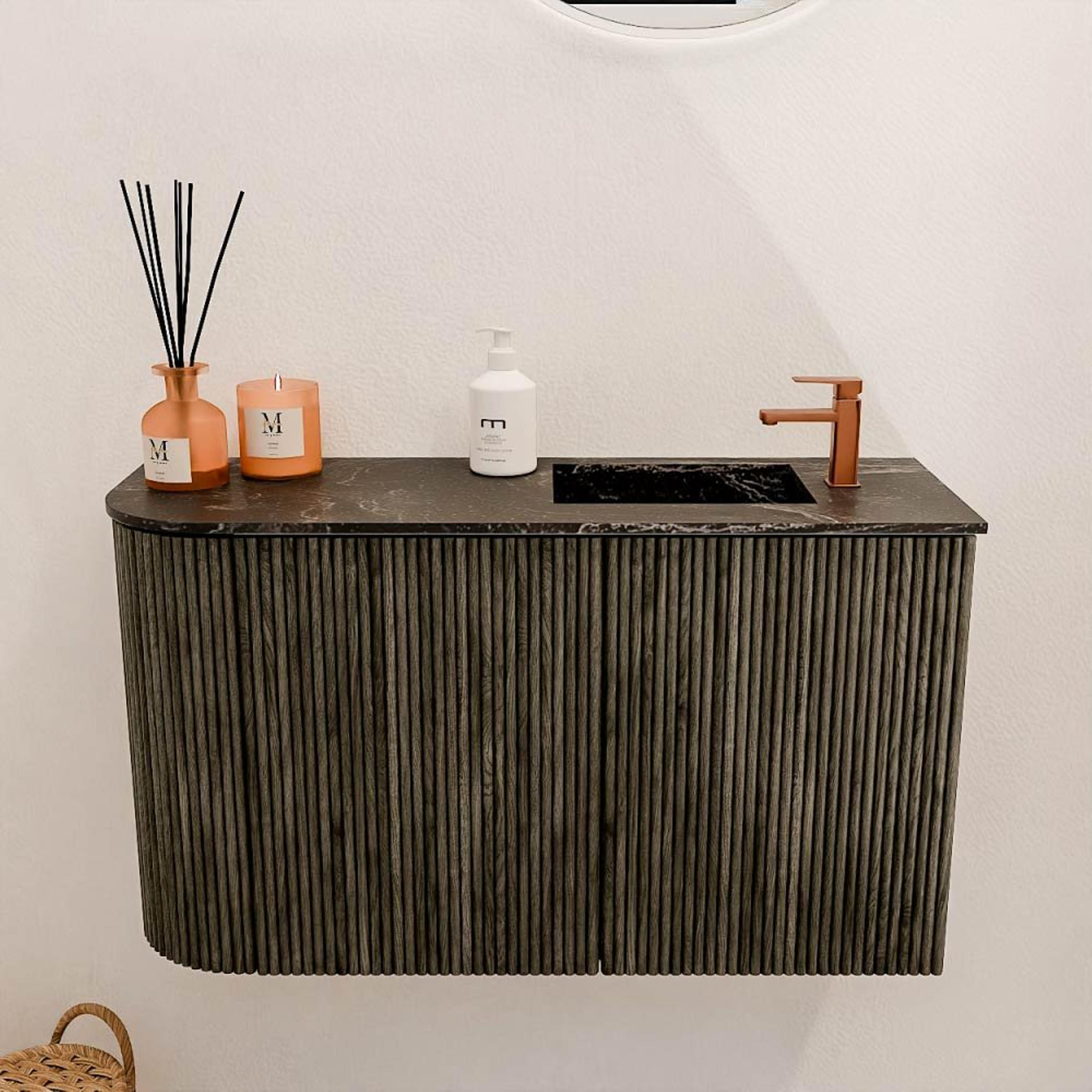 De combinatie van massief eikenhout aan de voorkant en eikenfineer op de zijkanten geeft het meubel een natuurlijke en hoogwaardige uitstraling. De verticale ribbelstructuur zorgt voor een subtiele textuur die het meubel een tijdloze elegantie geeft. De kleur Shadow is diep en sfeervol, waardoor het meubel moeiteloos aansluit bij verschillende badkamerstijlen. Door het unieke ontwerp met een ronde hoek aan de linkerkant krijgt jouw badkamer een speels accent zonder in te leveren op rust en harmonie. Dit meubel is een echte eyecatcher die jouw badkamer een exclusieve uitstraling geeft.