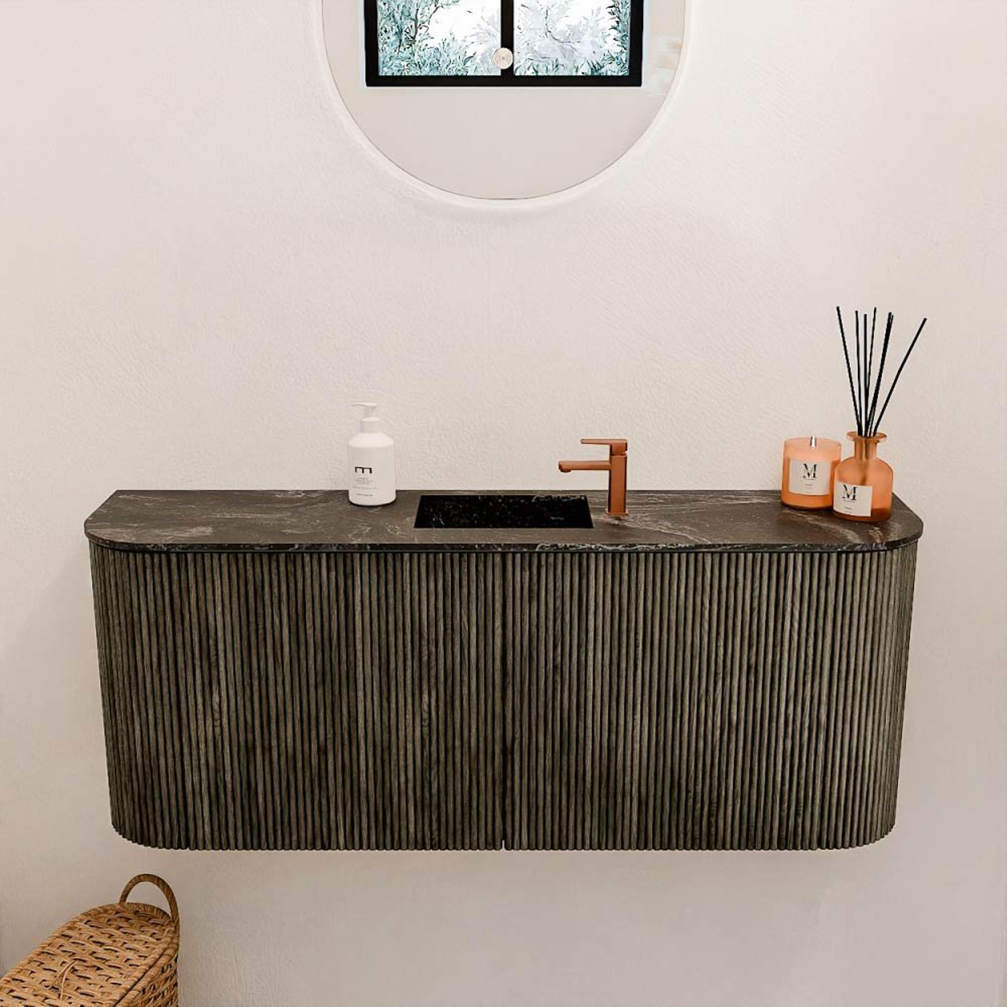 Met dit prachtige meubel geef je jouw badkamer een stijlvolle en warme uitstraling die direct opvalt. Het combineert de natuurlijke charme van massief eikenhout met een modern, strak design en subtiele rondingen aan beide zijden. De diepe schaduwkleur zorgt voor een elegante sfeer, terwijl de compacte diepte van 24,5 cm perfect is voor zowel ruime als kleinere badkamers. De wastafel in lava-kleur met een centraal kraangat maakt het geheel compleet en biedt je volop gebruiksgemak. Dankzij de slimme soft-close en push-to-open deuren geniet je van een stille en soepele bediening, wat bijdraagt aan een ontspannen badkamerervaring. Dit meubel transformeert jouw ruimte moeiteloos in een plek waar je elke dag met plezier begint en eindigt.