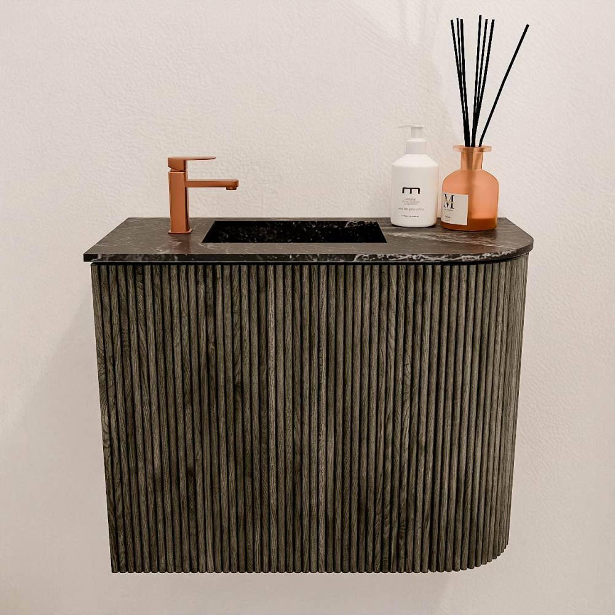Met dit fraaie meubel geef je jouw badkamer direct een stijlvolle en warme uitstraling. Het compacte formaat maakt het ideaal voor kleinere ruimtes, zonder in te leveren op functionaliteit of design. De subtiele ronding aan de rechterkant zorgt voor een speels en modern accent, terwijl de combinatie van de diepe Shadow-kleur en de lava-kleurige wastafel een prachtig contrast vormt. Dankzij de slimme indeling met de wastafel aan de linkerkant en het praktische kraangat geniet je van optimaal gebruiksgemak. Dit meubel brengt niet alleen sfeer, maar ook rust en overzicht in je badkamer, waardoor het een waardevolle toevoeging is die je dagelijks plezier geeft.