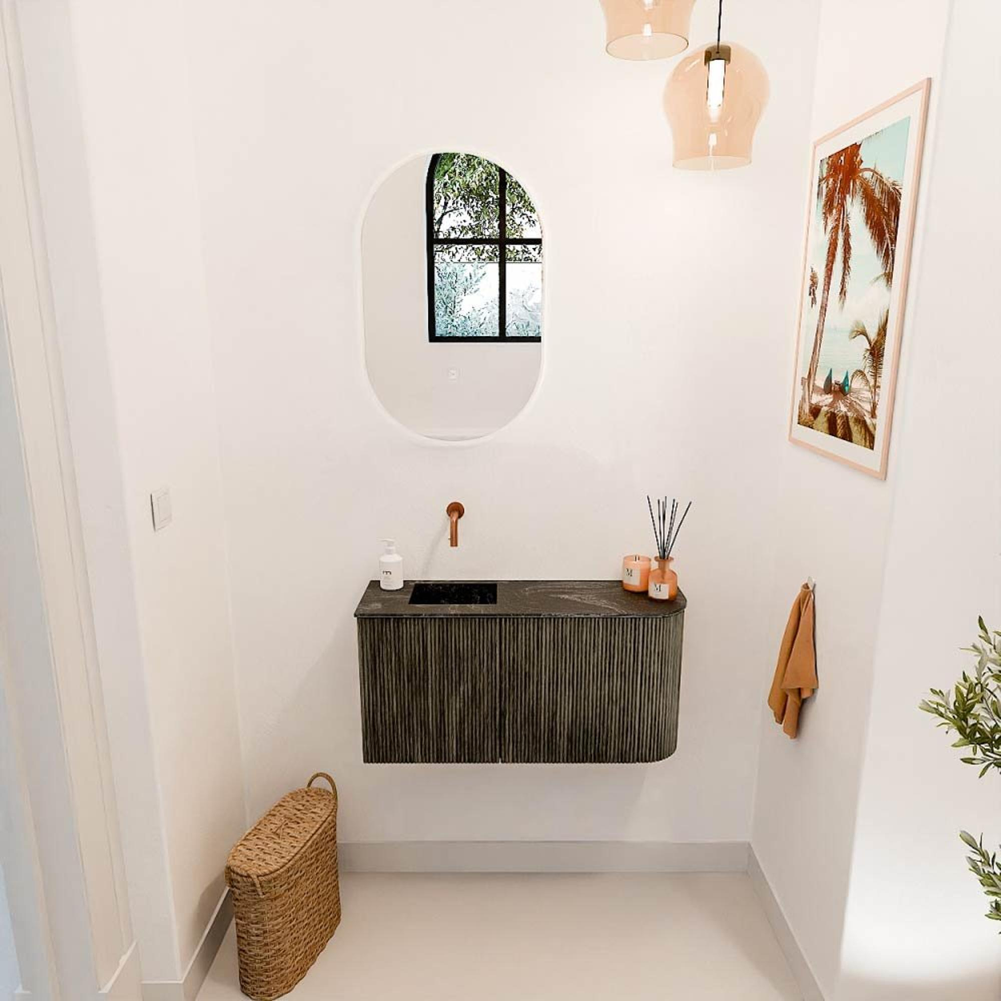 Transformeer je badkamer met dit prachtige meubel dat niet alleen praktisch is, maar ook een stijlvolle blikvanger vormt. De subtiele ronding aan de rechterzijde geeft het meubel een uniek karakter, terwijl de diepe schaduwkleur een warme en moderne sfeer toevoegt. Dankzij de zorgvuldig gekozen combinatie met de Faye wastafel in Lava-kleur, die links gepositioneerd is zonder kraangat, geniet je van een strakke en minimalistische uitstraling. Dit meubel biedt niet alleen ruimte om je badkamer netjes en georganiseerd te houden, maar zorgt ook voor een gevoel van rust en luxe. De verticale ribbelstructuur op het front voegt een verfijnde textuur toe die het geheel een tijdloze elegantie geeft. Zo wordt jouw badkamer een plek waar je elke dag met plezier begint en eindigt.