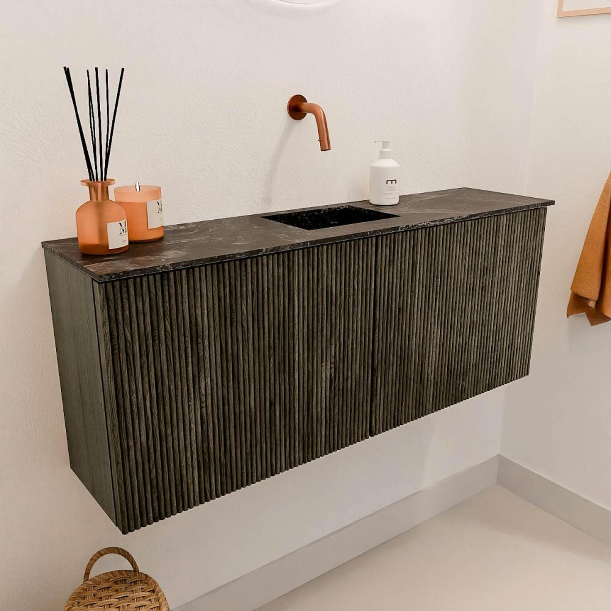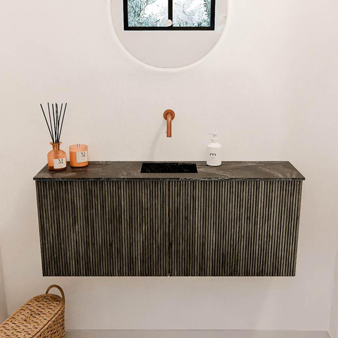 De combinatie van de diepe, matte kleur Shadow met de zwarte Lava wastafel zorgt voor een tijdloos en verfijnd geheel. Dit meubel is een echte blikvanger die jouw badkamer een luxe uitstraling geeft zonder te overheersen. Het minimalistische design met strakke lijnen past perfect in moderne badkamers, maar voegt ook een verrassend contrast toe aan meer klassieke interieurs. Door de subtiele kleurtonen blijft het meubel rustig ogen, wat bijdraagt aan een ontspannen sfeer. Zo geniet je elke dag van een badkamer die niet alleen functioneel is, maar ook uitnodigt tot rust en comfort.