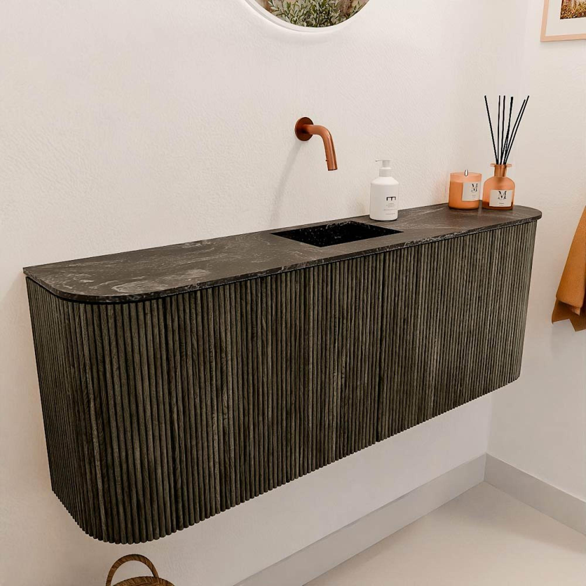 Het meubel valt direct op door zijn elegante rondingen aan beide kanten, die het geheel een zachte en moderne uitstraling geven. De kleur Shadow is diep en tijdloos, waardoor het perfect combineert met verschillende badkamerstijlen. De wastafel in Lava voegt een warm contrast toe, wat zorgt voor een harmonieuze balans tussen koel en warm. Dit stijlvolle design maakt jouw badkamer niet alleen mooier, maar ook uitnodigender. Door de hoogwaardige afwerking met massief eikenhout en eikenfineer straalt het meubel luxe en klasse uit. Zo geniet je elke dag van een badkamer die er niet alleen goed uitziet, maar ook een gevoel van rust en comfort biedt.