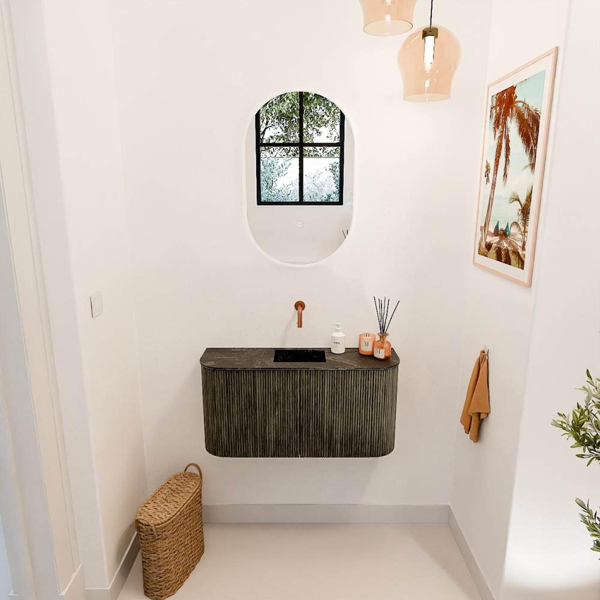 Een badkamermeubel dat direct sfeer en elegantie toevoegt aan jouw badkamer, zonder in te leveren op functionaliteit. Dit meubel combineert een moderne uitstraling met praktische details, waardoor het niet alleen een blikvanger is, maar ook een slimme oplossing voor jouw dagelijkse routine. Met zijn subtiele rondingen aan beide zijden en de warme, diepe kleur Shadow creëer je een rustige en stijlvolle ambiance. De wastafel in Lava-kleur, centraal gepositioneerd en zonder kraangat, biedt je de vrijheid om zelf de kraan te kiezen die het beste bij jouw stijl en wensen past. Zo transformeer je jouw badkamer in een plek waar je elke dag met plezier begint en eindigt.Stijlvol