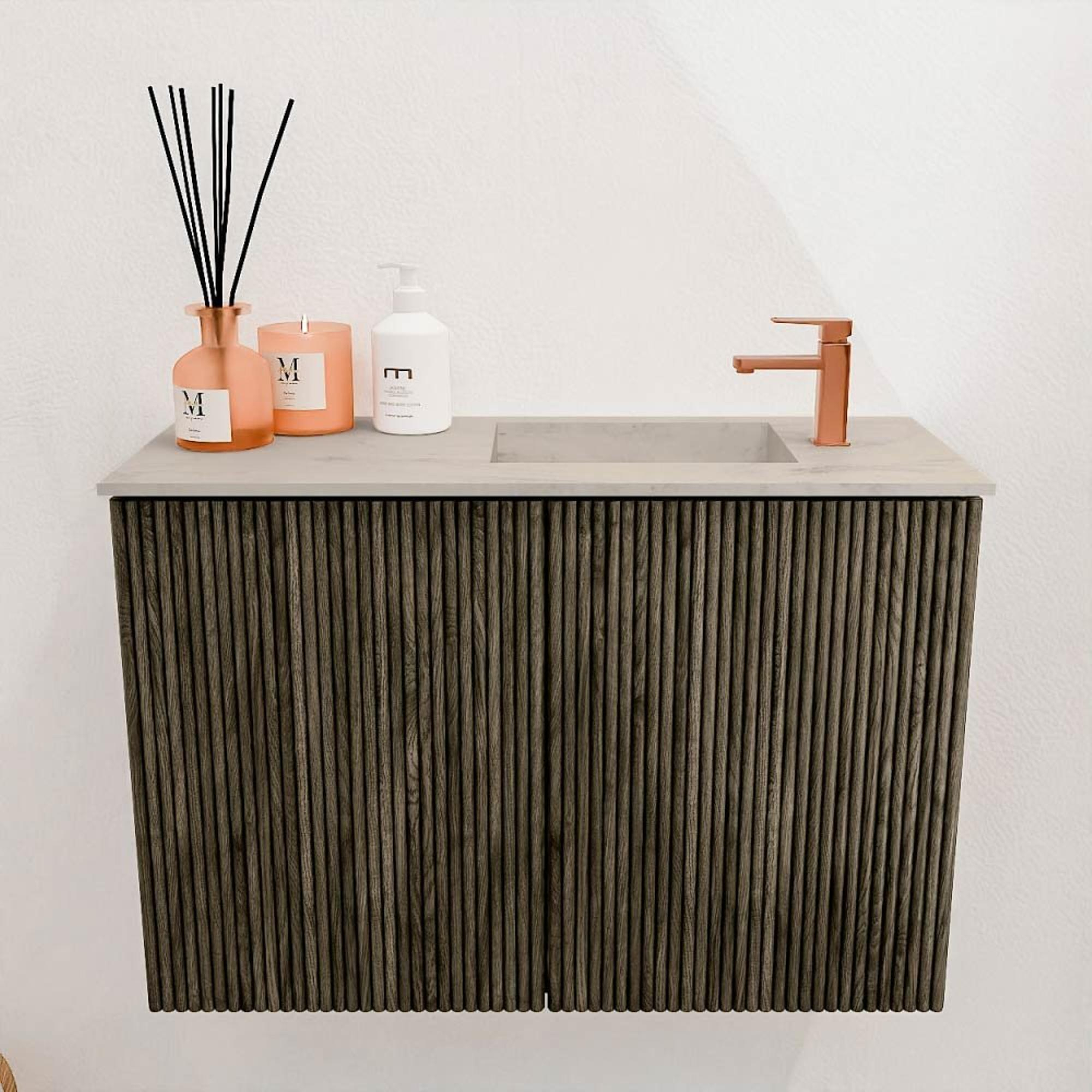 De combinatie van het warme Shadow-grijs met de heldere Opalo-wastafel geeft dit meubel een elegante en tijdloze uitstraling. Het gebruik van massief eikenhout en eikenfineer zorgt voor een natuurlijke en authentieke look die je badkamer direct verrijkt. Door het strakke, minimalistische design past het meubel moeiteloos in verschillende interieurstijlen. Zo creëer je een harmonieuze sfeer waarin je je elke dag weer prettig voelt. De subtiele details, zoals de metalen geleiders van de deuren, maken het geheel af en benadrukken de hoogwaardige afwerking.