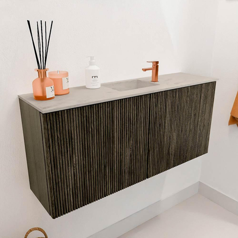 Het meubel valt direct op door zijn verfijnde uitstraling. Het gebruik van massief eikenhout aan de voorkant geeft het een warme, natuurlijke look die perfect past in een modern interieur. De verticale groeven zorgen voor een subtiel speels effect, waardoor het meubel niet alleen functioneel is, maar ook een echte blikvanger wordt. De kleur Shadow voegt een tijdloze elegantie toe die moeiteloos combineert met verschillende badkamerstijlen. Zo creëer je een harmonieuze sfeer waarin je je helemaal thuis voelt.
