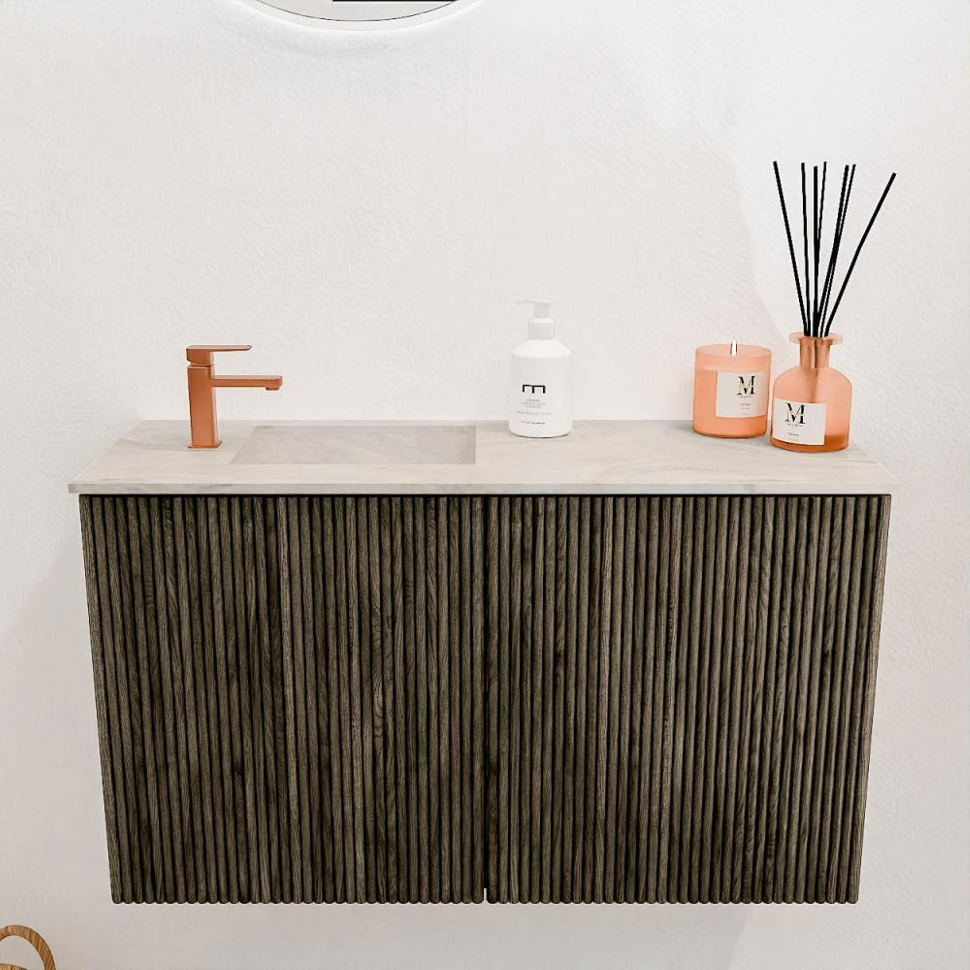 - Wastafelmodel Faye in kleur Ostra met kraangat links – praktisch en stijlvol