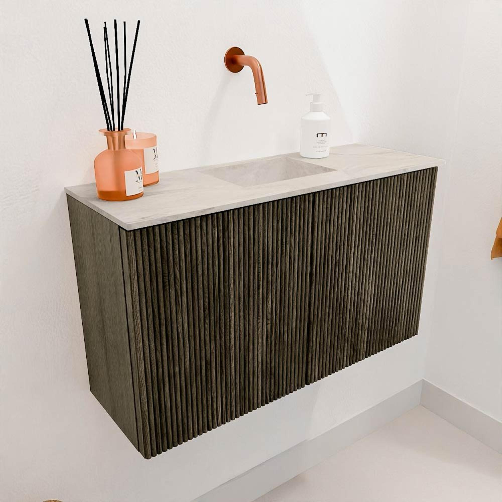 Dit meubel valt direct op door zijn verfijnde, verticale ribbelstructuur op de fronten, uitgevoerd in een warme Shadow-kleur. De combinatie met de lichte Ostra-wastafel zorgt voor een subtiel contrast dat rust en elegantie uitstraalt. Door het gebruik van massief eikenhout en eikenfineer krijgt het meubel een natuurlijke en hoogwaardige uitstraling die perfect past in een modern interieur. Zo voeg je niet alleen een functioneel element toe, maar ook een stijlvol statement dat je badkamer naar een hoger niveau tilt.