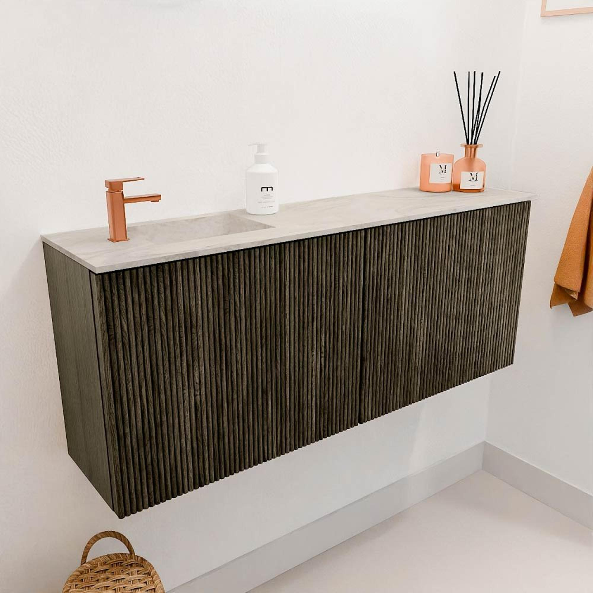De verticale ribbelstructuur op het meubel geeft een subtiele, maar opvallende textuur die jouw badkamer een unieke uitstraling geeft. De combinatie van de donkere Shadow-kleur met het lichte Ostra van de wastafel zorgt voor een prachtig contrast dat zowel modern als tijdloos oogt. Dit meubel is ontworpen met oog voor detail en esthetiek, waardoor het een echte blikvanger is. Dankzij het gebruik van massief eiken krijgt het geheel een natuurlijke warmte die je badkamer extra karakter geeft. Zo creëer je een ruimte die niet alleen functioneel is, maar ook een lust voor het oog.