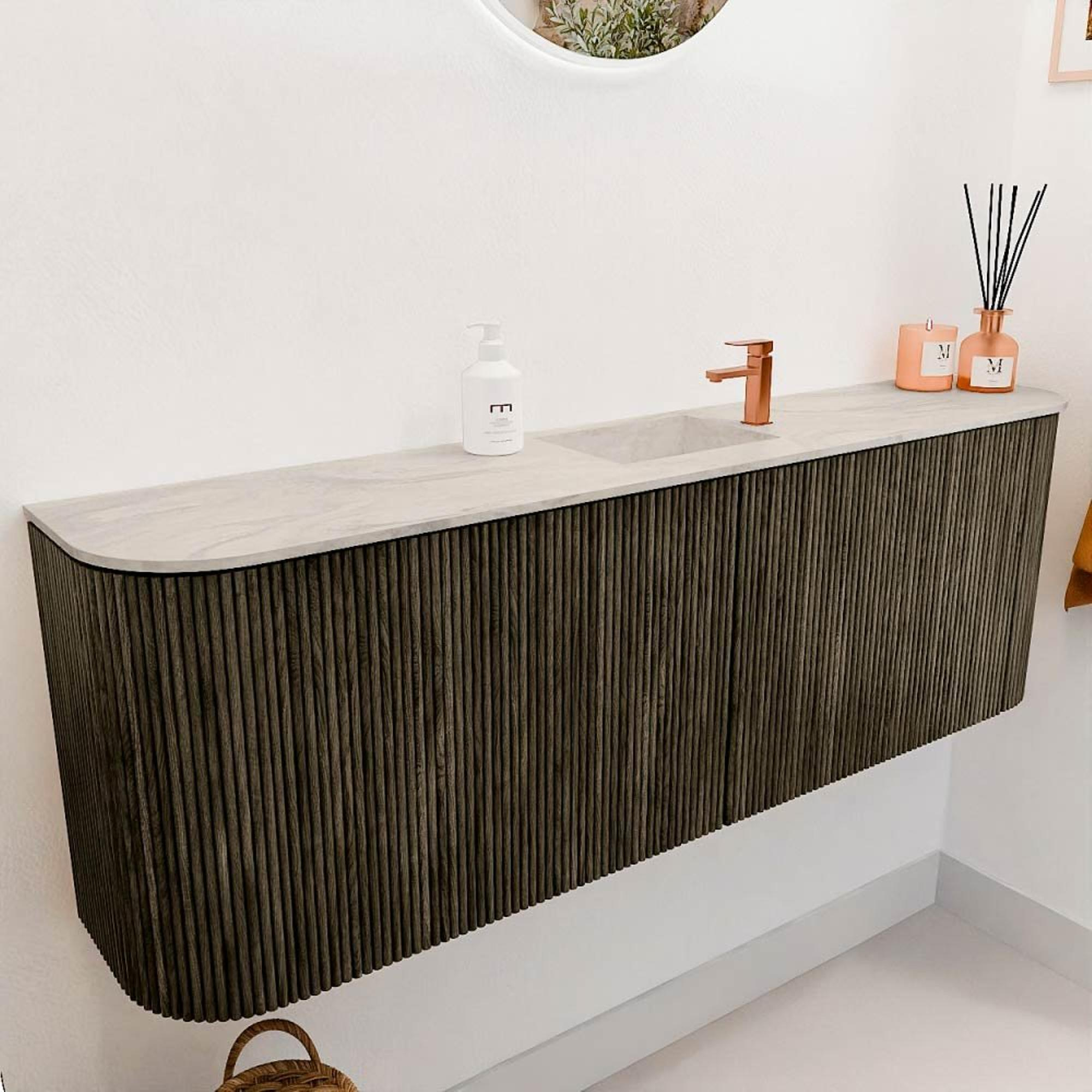 Met dit prachtige meubel geef je jouw badkamer direct een stijlvolle en warme uitstraling. Het combineert natuurlijke materialen met een modern design, waardoor het niet alleen praktisch is, maar ook een echte blikvanger in je ruimte. Dankzij de subtiele rondingen aan beide zijden voelt het meubel zacht en uitnodigend aan, terwijl de kleur Shadow een rustige en elegante sfeer creëert. De wastafel in de kleur Ostra met een centraal geplaatste kraangat maakt het geheel compleet en zorgt voor optimaal gebruiksgemak. Dit meubel is ontworpen om jouw badkamer te transformeren tot een plek waar je elke dag met plezier begint en eindigt.