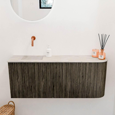 Met dit prachtige meubel geef je jouw badkamer of gastentoilet direct een stijlvolle en moderne uitstraling. Het meubel combineert een warme, natuurlijke uitstraling dankzij het gebruik van echt hout met een eigentijds design dat perfect aansluit bij diverse interieurstijlen. De subtiele ronding aan de rechterkant zorgt voor een speels en uniek detail, terwijl de kleur Shadow het geheel een stoere en toch verfijnde look geeft. De wastafel in Ostra-kleur met een linkerpositie zonder kraangat maakt het mogelijk om zelf de kraan te kiezen die het beste bij jouw wensen past. Dit meubel is niet alleen een lust voor het oog, maar ook uiterst praktisch: dankzij de wandmontage creëer je extra ruimte op de vloer, wat vooral in kleinere badkamers of toiletten een groot voordeel is. Zo geniet je van een opgeruimde en frisse sfeer waarin je elke dag met plezier begint.