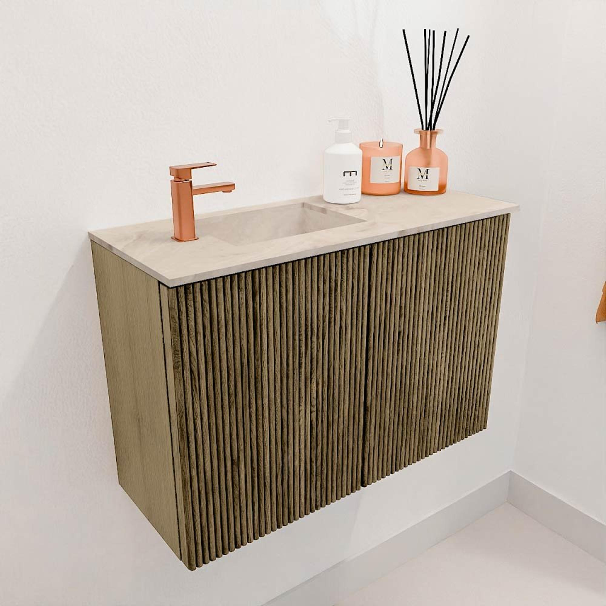 De verticale groeven in het front van het meubel geven het een tijdloze en verfijnde uitstraling. De kleur Dusk is een warme, natuurlijke tint die moeiteloos aansluit bij diverse badkamerstijlen, van modern tot klassiek. Het gebruik van massief eikenhout voor de fronten zorgt voor een luxe en authentieke look, terwijl de zijpanelen zijn afgewerkt met eikenfineer voor een subtiel contrast. Dit meubel is een echte blikvanger die jouw badkamer een unieke en persoonlijke touch geeft.