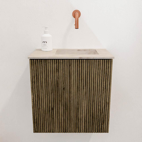 De combinatie van massief eikenhout met een warme Dusk-kleur zorgt voor een tijdloze en natuurlijke uitstraling. De verticale groeven in het front geven het meubel een subtiele, maar opvallende designaccent die jouw badkamer direct karakter geeft. Dit meubel past perfect in moderne en klassieke interieurs, waardoor je verzekerd bent van een stijlvolle toevoeging die nooit uit de mode raakt. Dankzij het compacte formaat is het ideaal voor kleinere ruimtes, zonder dat je concessies hoeft te doen aan de elegantie en uitstraling.