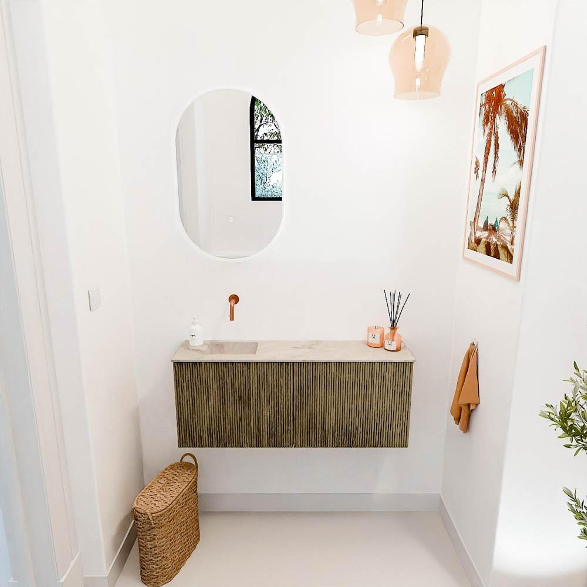 Met een breedte van 100 cm en een diepte van 24,5 cm biedt dit meubel voldoende opbergruimte zonder te veel ruimte in te nemen. De wastafel is slim gepositioneerd aan de linkerkant, wat zorgt voor een praktische indeling die aansluit bij jouw dagelijkse gebruik. Het ontbreken van een kraangat geeft je de vrijheid om zelf een kraan te kiezen die perfect bij jouw stijl en wensen past. Dankzij de soft-close deuren blijft alles netjes en stil, wat bijdraagt aan een ontspannen sfeer in je badkamer.