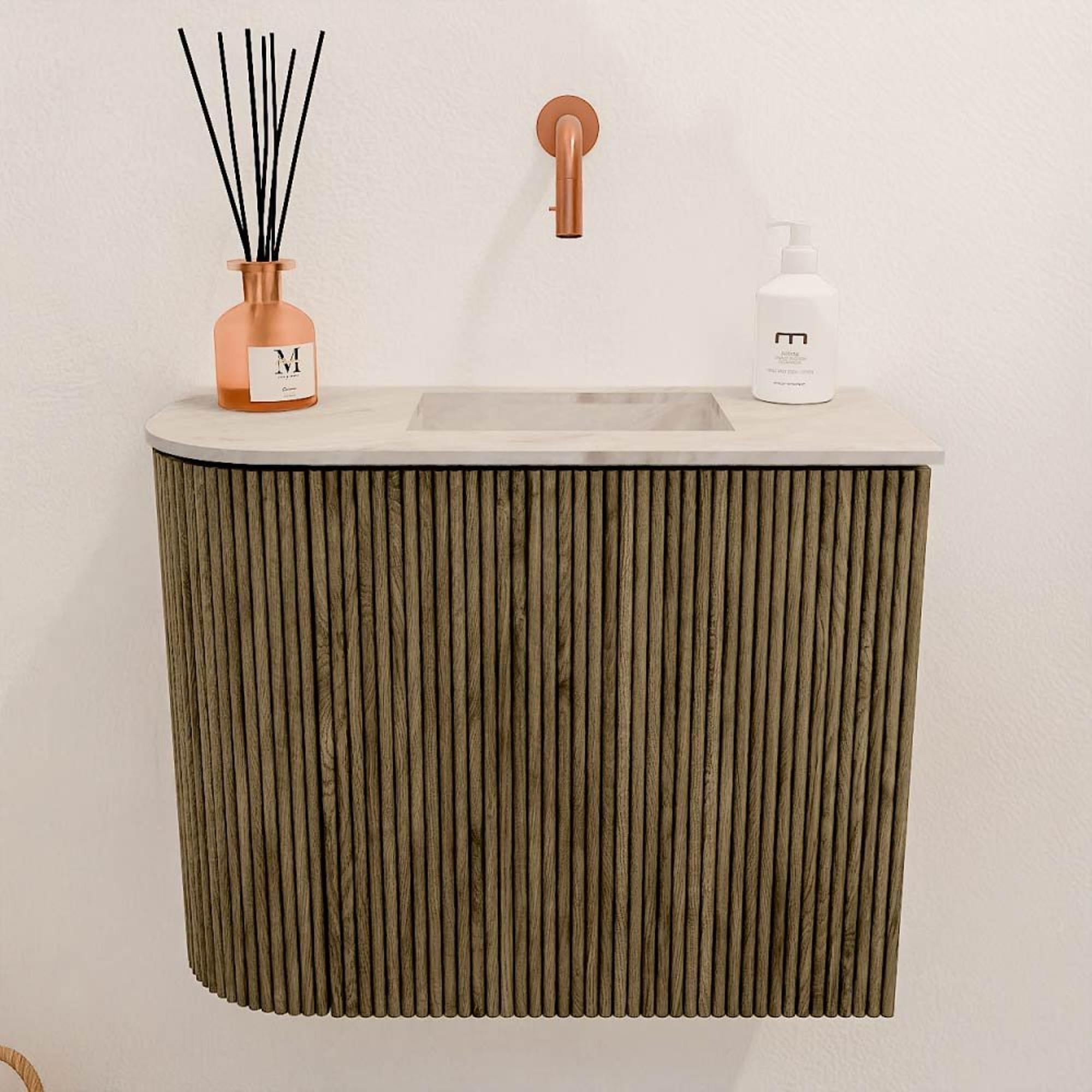 De natuurlijke houtafwerking in de warme Dusk-kleur geeft het meubel een tijdloze en elegante uitstraling. De subtiele ronding aan de linkerkant maakt het ontwerp uniek en zorgt voor een zachte, uitnodigende sfeer. Door de combinatie met de lichte Frappe-wastafel ontstaat een fraai contrast dat jouw badkamer direct een luxe uitstraling geeft. Dit meubel is een echte blikvanger die moeiteloos aansluit bij diverse interieurstijlen, van modern tot klassiek. Zo geniet je elke dag van een badkamer die niet alleen functioneel is, maar ook prachtig oogt.