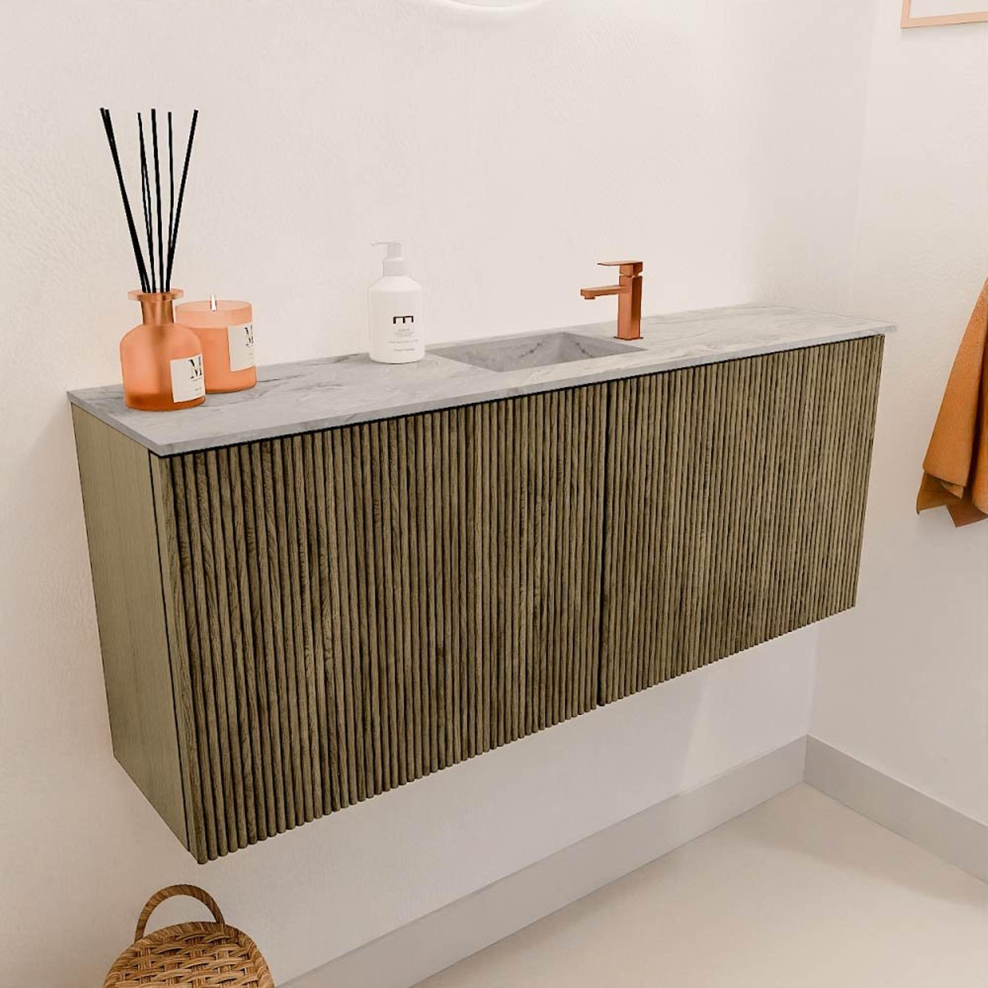 De combinatie van massief eiken en eikenfineer in een warme Dusk-kleur geeft dit meubel een natuurlijke en luxe uitstraling. De verticale ribbelstructuur op de fronten voegt een subtiel speels detail toe dat de aandacht trekt zonder te overheersen. Dit zorgt ervoor dat het meubel een echte blikvanger wordt in jouw badkamer. Door het tijdloze ontwerp past het moeiteloos bij verschillende interieurstijlen, van modern tot klassiek. Zo ben je verzekerd van een meubel dat jarenlang mooi blijft en jouw badkamer een stijlvolle upgrade geeft.