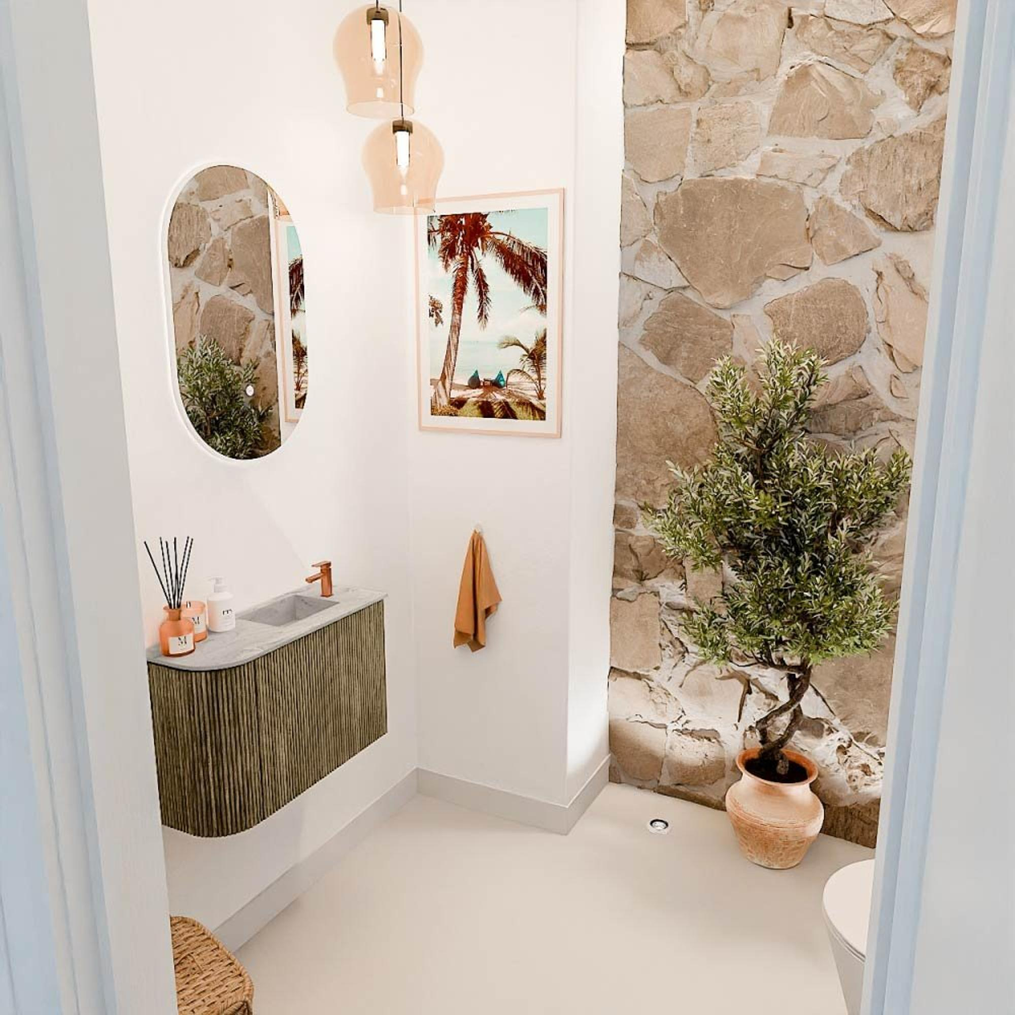 Het meubel valt direct op door zijn moderne en verfijnde design. De zachte ronding aan de linkerkant geeft het een unieke uitstraling die afwijkt van standaard rechthoekige meubels. De kleur Dusk voegt een warme, natuurlijke tint toe die perfect combineert met de lichte Glace-wastafel. Dit zorgt voor een tijdloze look die moeiteloos past in diverse badkamerstijlen, van strak modern tot warm Scandinavisch. Door te kiezen voor dit meubel voeg je een stijlvol element toe dat jouw badkamer een persoonlijke en uitnodigende sfeer geeft.