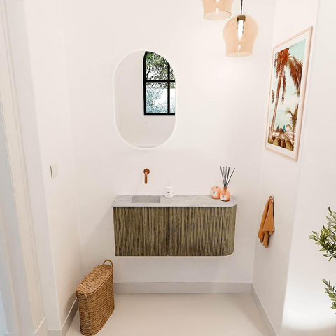 Het meubel valt direct op door zijn tijdloze en verfijnde uitstraling. De warme, donkere kleur Dusk geeft een luxe gevoel zonder te overheersen, terwijl de lichte wastafel in Glace het geheel fris en uitnodigend houdt. De ronding aan de rechterkant voegt een uniek detail toe dat het meubel onderscheidt van standaard badkamermeubels. Zo creëer je een badkamer die niet alleen praktisch is, maar ook een echte designstatement maakt. Dankzij het hoogwaardige afwerkingsniveau en het gebruik van massief eikenhout voor de fronten straalt het meubel kwaliteit en vakmanschap uit, iets wat je elke dag zult waarderen.