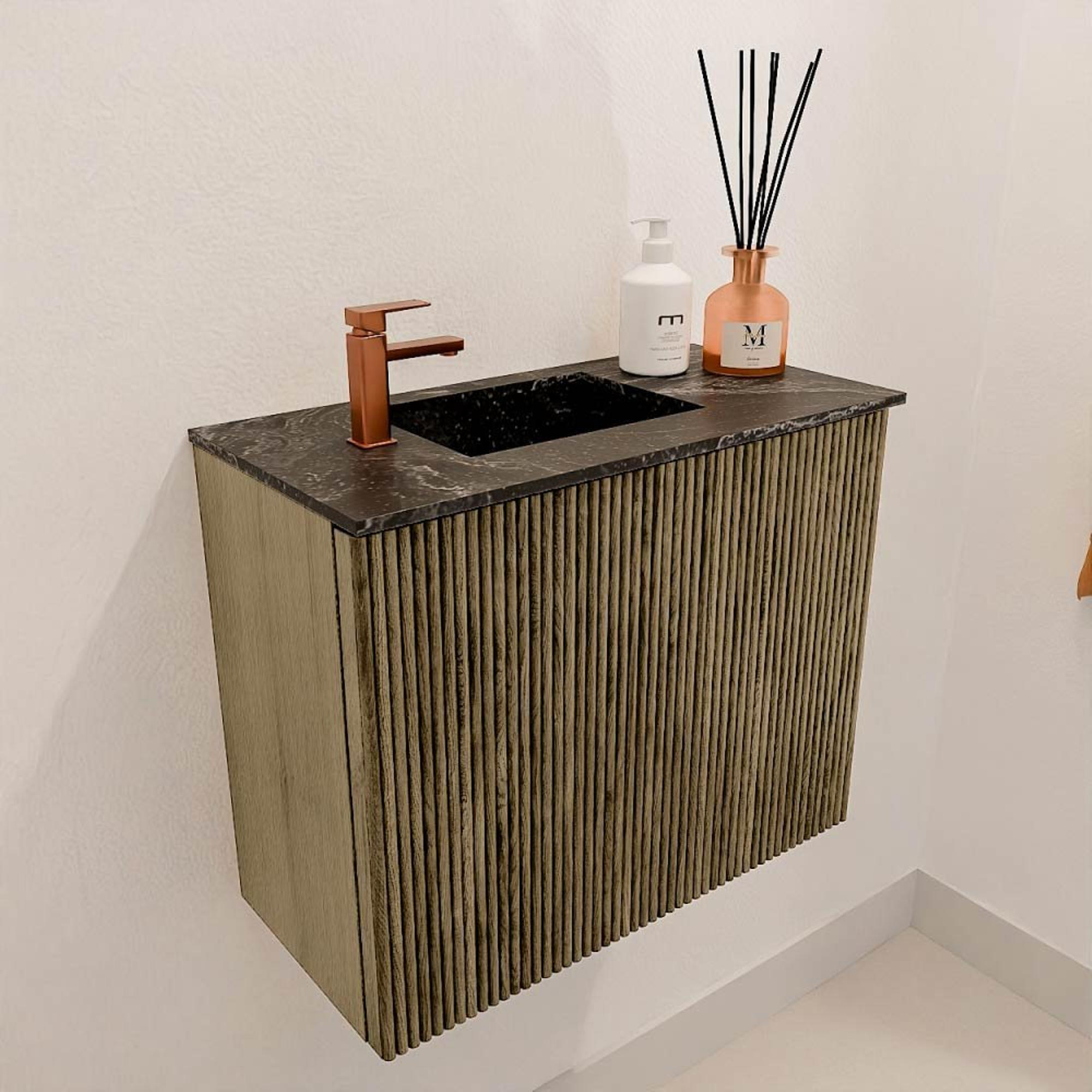 Dit meubel valt direct op door zijn tijdloze en natuurlijke uitstraling. De fronten van massief eikenhout met verticale ribbelstructuur geven het een unieke textuur en een luxe gevoel. De combinatie van de diepe Dusk-kleur van het meubel met de Lava-kleurige wastafel zorgt voor een spannend contrast dat toch harmonieus oogt. Zo voeg je een warm accent toe aan je badkamer dat moeiteloos past bij diverse interieurstijlen, van modern tot klassiek. Door het subtiele design blijft het meubel een blikvanger zonder te overheersen, waardoor het een stijlvolle basis vormt voor jouw persoonlijke badkamerstijl.