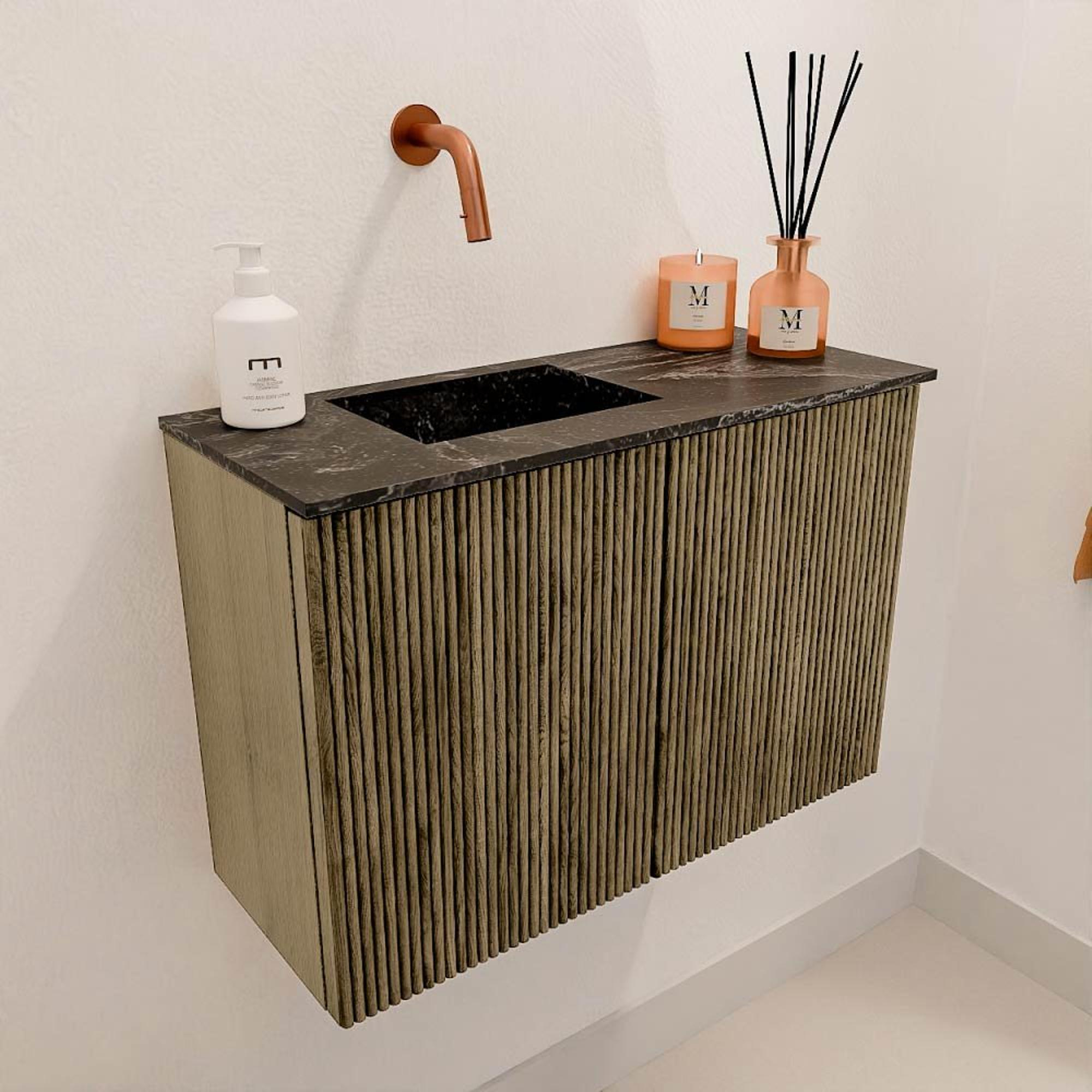 Met twee ruime deuren biedt het meubel voldoende opbergruimte om al je toiletartikelen netjes en uit het zicht te bewaren. De wastafel is slim gepositioneerd aan de linkerkant, waardoor je optimaal gebruikmaakt van de beschikbare ruimte. Het ontbreken van een kraangat geeft je de vrijheid om zelf de kraan te kiezen die het beste bij jouw wensen past, wat extra maatwerk en flexibiliteit biedt. Dankzij de wandmontage oogt het meubel licht en ruimtelijk, terwijl het toch stevig en stabiel aan de muur hangt. Zo combineer je moeiteloos stijl met praktisch gebruiksgemak.