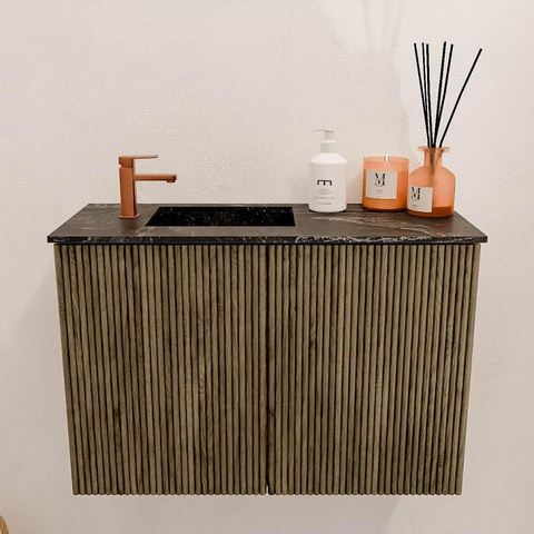 De warme, donkere tint Dusk geeft het meubel een tijdloze en elegante uitstraling die moeiteloos past in diverse interieurstijlen. Of je nu kiest voor een minimalistische, industriële of juist een meer klassieke inrichting, dit meubel voegt altijd een vleugje verfijning toe. De lava-kleurige wastafel vormt een prachtig contrast en accentueert het geheel, waardoor jouw badkamer een echte blikvanger wordt. Met dit meubel kies je voor een design dat niet alleen mooi is, maar ook uitnodigt tot ontspannen momenten in jouw persoonlijke wellnessruimte.
