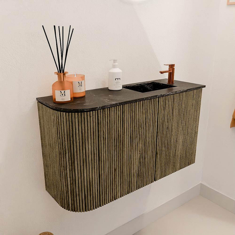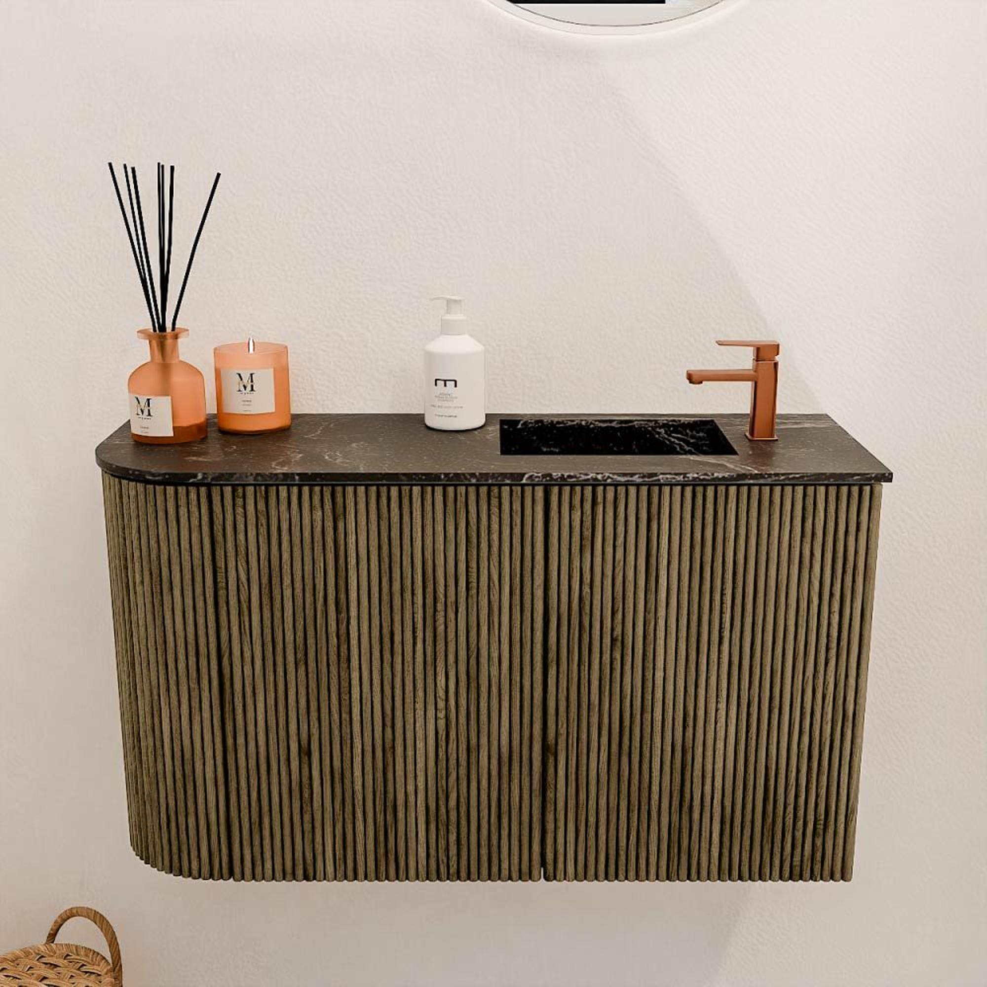 Met dit prachtige meubel geef je jouw badkamer direct een stijlvolle en warme uitstraling. Het compacte ontwerp met een subtiele ronding aan de linkerkant zorgt voor een speels en modern effect, terwijl de diepe kleur Dusk een rustige sfeer creëert. Dankzij de hoogwaardige afwerking met massief eiken fronten en eiken fineer zijpanelen geniet je van een meubel dat niet alleen mooi oogt, maar ook duurzaam en robuust is. De wastafel, uitgevoerd in Lava en voorzien van een kraangat aan de rechterkant, maakt het geheel compleet en biedt je volop comfort tijdens het gebruik. Dit meubel is perfect voor wie op zoek is naar een combinatie van elegantie en functionaliteit, zonder in te leveren op kwaliteit. Het wandmeubel neemt weinig ruimte in beslag, waardoor het ook ideaal is voor kleinere badkamers of toiletruimtes. Zo transformeer je jouw badkamer eenvoudig in een plek waar je elke dag met plezier begint en eindigt.
