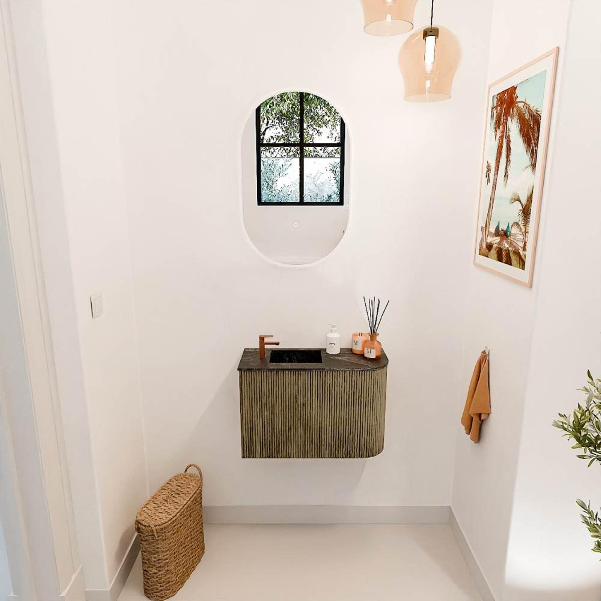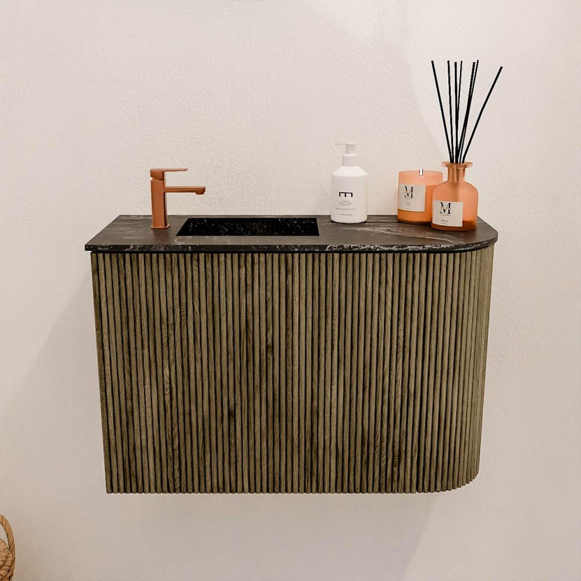 Het meubel valt meteen op door zijn elegante design en hoogwaardige afwerking. De warme Dusk-kleur in combinatie met het natuurlijke eikenhout geeft jouw toilet een tijdloze en luxe uitstraling. De subtiele ronding aan de rechterkant zorgt voor een speels detail dat het meubel uniek maakt. Door het gebruik van verticale ribbels op de fronten ontstaat een verfijnde textuur die het geheel extra karakter geeft. Zo creëer je een ruimte die niet alleen functioneel is, maar ook uitnodigt om even te ontspannen. Met dit stijlvolle meubel voeg je een echte eyecatcher toe aan je badkamer die moeiteloos past bij diverse interieurstijlen.