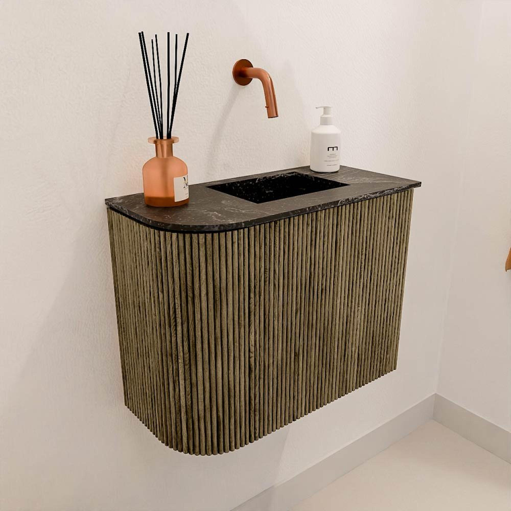 - Wastafelmodel Faye in Lava-kleur zonder kraangat, rechts gepositioneerd voor optimale functionaliteit