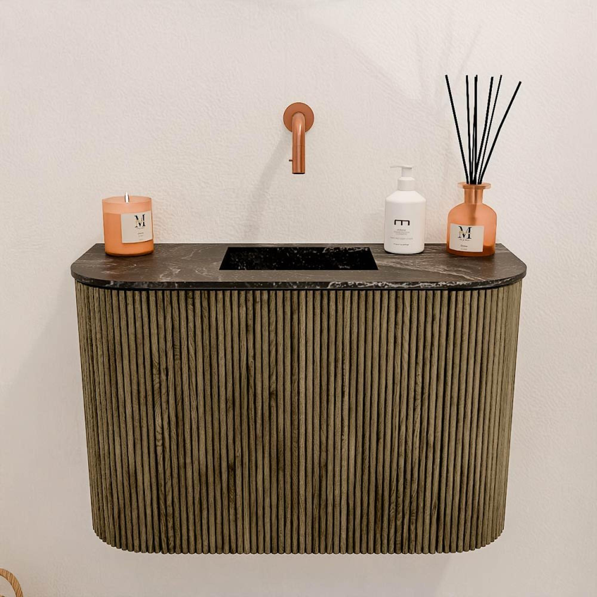 De combinatie van de diepe, matte kleur Dusk en de Lava wastafel geeft dit meubel een luxe en tijdloze uitstraling. De afgeronde zijkanten zorgen voor een uniek design dat direct opvalt, zonder te overheersen. Dit meubel is een echte blikvanger die jouw badkamer een moderne en verfijnde uitstraling geeft. Door de centrale positie van de wastafel ontstaat een perfecte balans, waardoor het geheel harmonieus oogt. Zo geniet je niet alleen van een functioneel meubel, maar ook van een stijlvol element dat jouw badkamer naar een hoger niveau tilt.