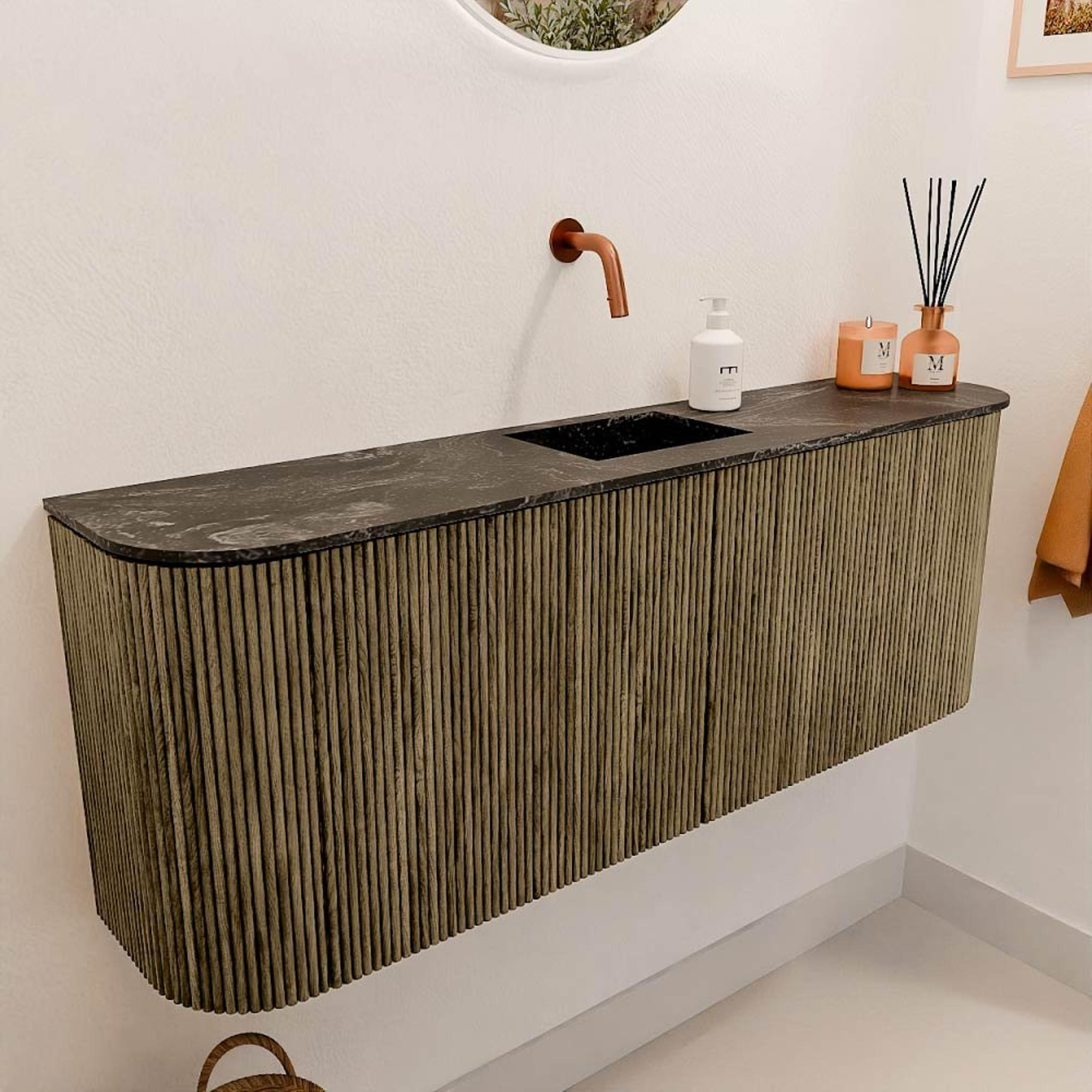 Dit meubel valt direct op door zijn tijdloze en verfijnde uitstraling. De afgeronde hoeken aan beide zijden geven het een unieke, zachte vorm die niet alleen mooi oogt, maar ook veilig is in gebruik. De kleur Dusk is diep en natuurlijk, waardoor het meubel moeiteloos aansluit bij verschillende interieurstijlen, van modern tot klassiek. De lava-kleurige wastafel voegt een subtiel contrast toe, wat het geheel levendig en interessant maakt. Zo creëer je een badkamer die uitnodigt tot ontspanning en waar je met trots gasten ontvangt.