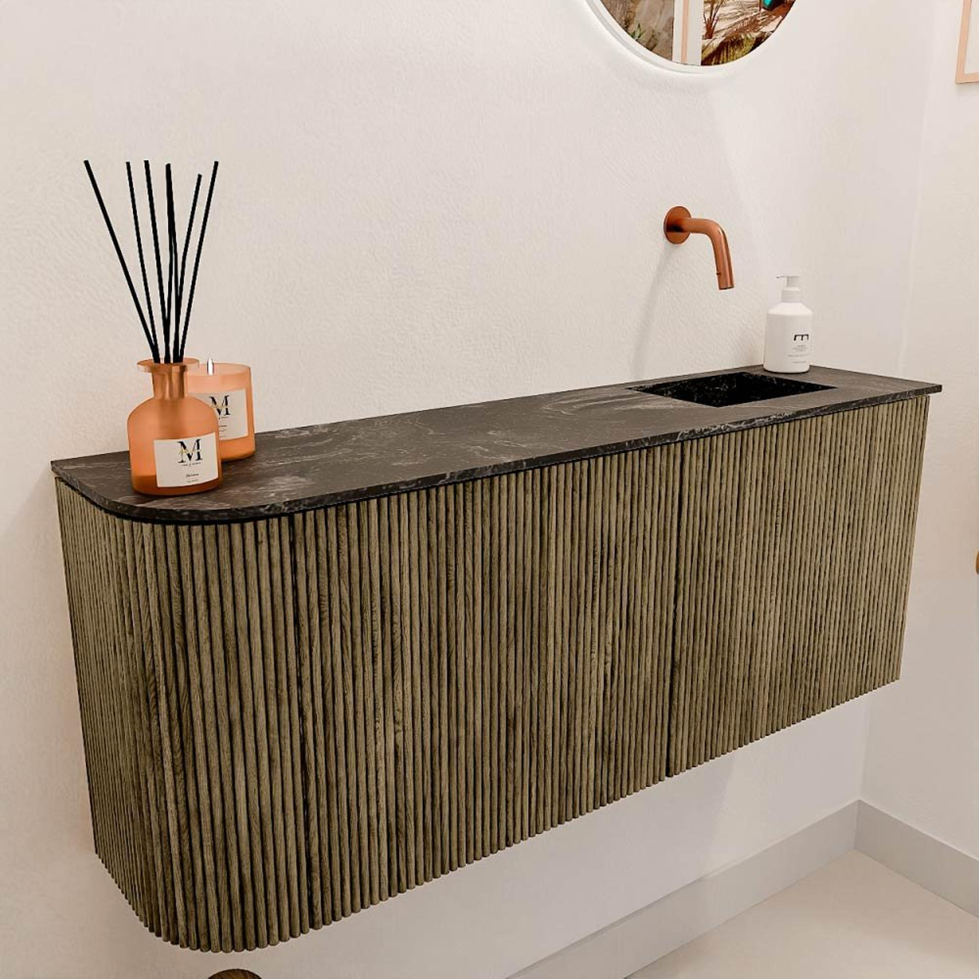 Met dit prachtige meubel geef je jouw badkamer direct een stijlvolle en warme uitstraling. Het combineert vakmanschap met een doordacht design, waardoor het niet alleen mooi oogt, maar ook uiterst praktisch is. Dankzij de subtiele ronding aan de linkerkant en de elegante kleur Dusk krijgt je ruimte een unieke en verfijnde sfeer. De wastafel, geplaatst aan de rechterzijde, biedt je volop comfort tijdens het gebruik. Zonder kraangat kun je zelf kiezen welke kraan het beste bij jouw stijl en wensen past. Dit meubel is een echte blikvanger die jouw badkamer transformeert tot een plek waar je elke dag met plezier begint en eindigt.