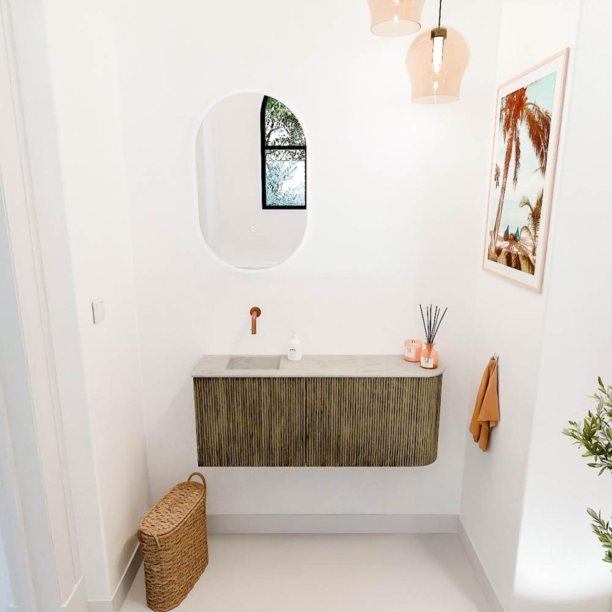 Het meubel valt direct op door zijn verfijnde design en hoogwaardige afwerking. De combinatie van massief eikenhout aan de voorkant met een subtiele eikenfineer aan de zijkanten zorgt voor een natuurlijke en luxe uitstraling. De kleur Dusk geeft het geheel een warme, rustige sfeer die moeiteloos aansluit bij diverse badkamerstijlen. Dankzij de ronde afwerking aan de rechterkant krijgt het meubel een speels en toch elegant karakter. Dit maakt het niet alleen een functioneel element, maar ook een echte blikvanger in jouw badkamer.