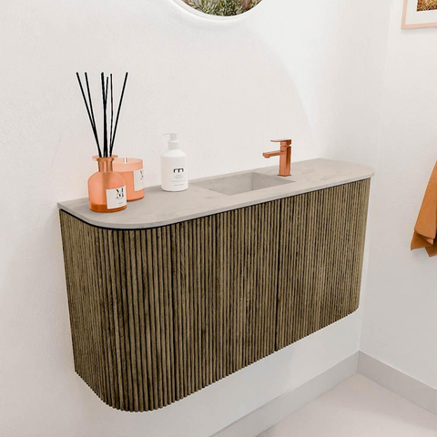 Het meubel valt direct op door zijn elegante vertical ribbing en de warme kleur Dusk, die samen een tijdloze en luxe uitstraling creëren. De afgeronde hoeken aan beide zijden geven het geheel een zachte, moderne touch die je badkamer een unieke sfeer geeft. Dit design sluit naadloos aan bij verschillende interieurstijlen, van strak modern tot warm Scandinavisch. Door te kiezen voor dit meubel voeg je niet alleen een functioneel element toe, maar ook een echte blikvanger die jouw badkamer karakter geeft.