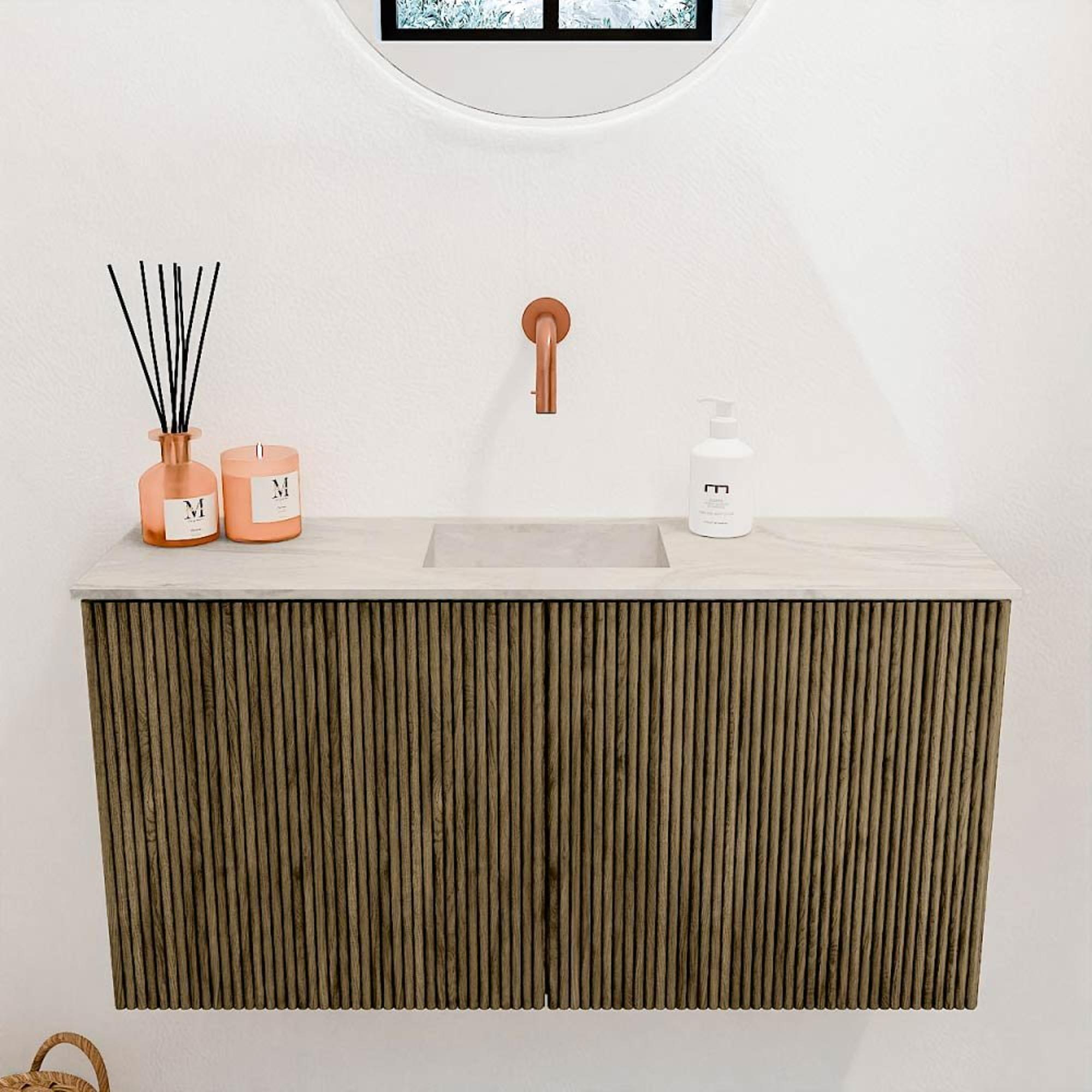 De verticale groeven in het massief eikenhout geven het meubel een unieke en verfijnde uitstraling die direct opvalt. De combinatie van de diepe Dusk-kleur met de lichte Ostra-wastafel zorgt voor een harmonieus en eigentijds geheel. Dit meubel is een echte blikvanger die jouw badkamer een luxe en warme sfeer geeft. Het design is tijdloos, waardoor het perfect past in zowel moderne als klassieke badkamers. Door de subtiele details en hoogwaardige afwerking geniet je jarenlang van een badkamer die er altijd verzorgd en stijlvol uitziet.