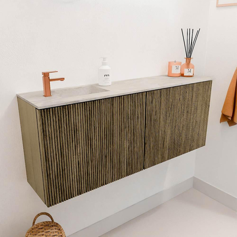 Met twee ruime deuren biedt het meubel voldoende opbergruimte om al je badkamerbenodigdheden netjes uit het zicht te houden. De wastafel heeft één kraangat en is links gepositioneerd, wat ideaal is voor een praktische indeling. Het gladde oppervlak van de wastafel maakt schoonmaken snel en eenvoudig, terwijl het compacte formaat van 100 cm breed perfect past in zowel kleinere als grotere badkamers. Zo combineer je stijl met optimaal gebruiksgemak.