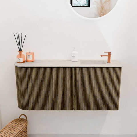 Het meubel valt direct op door zijn elegante uitstraling. De verticale ribbelstructuur op de fronten geeft een subtiele textuur die het meubel een luxe en tijdloze look geeft. De combinatie van het warme Dusk met de lichte Ostra wastafel zorgt voor een harmonieuze sfeer die rust en comfort uitstraalt. Dit maakt het meubel niet alleen een functioneel element, maar ook een echte eyecatcher in jouw badkamer. Zo geniet je van een stijlvolle omgeving die uitnodigt tot ontspanning en verzorging.