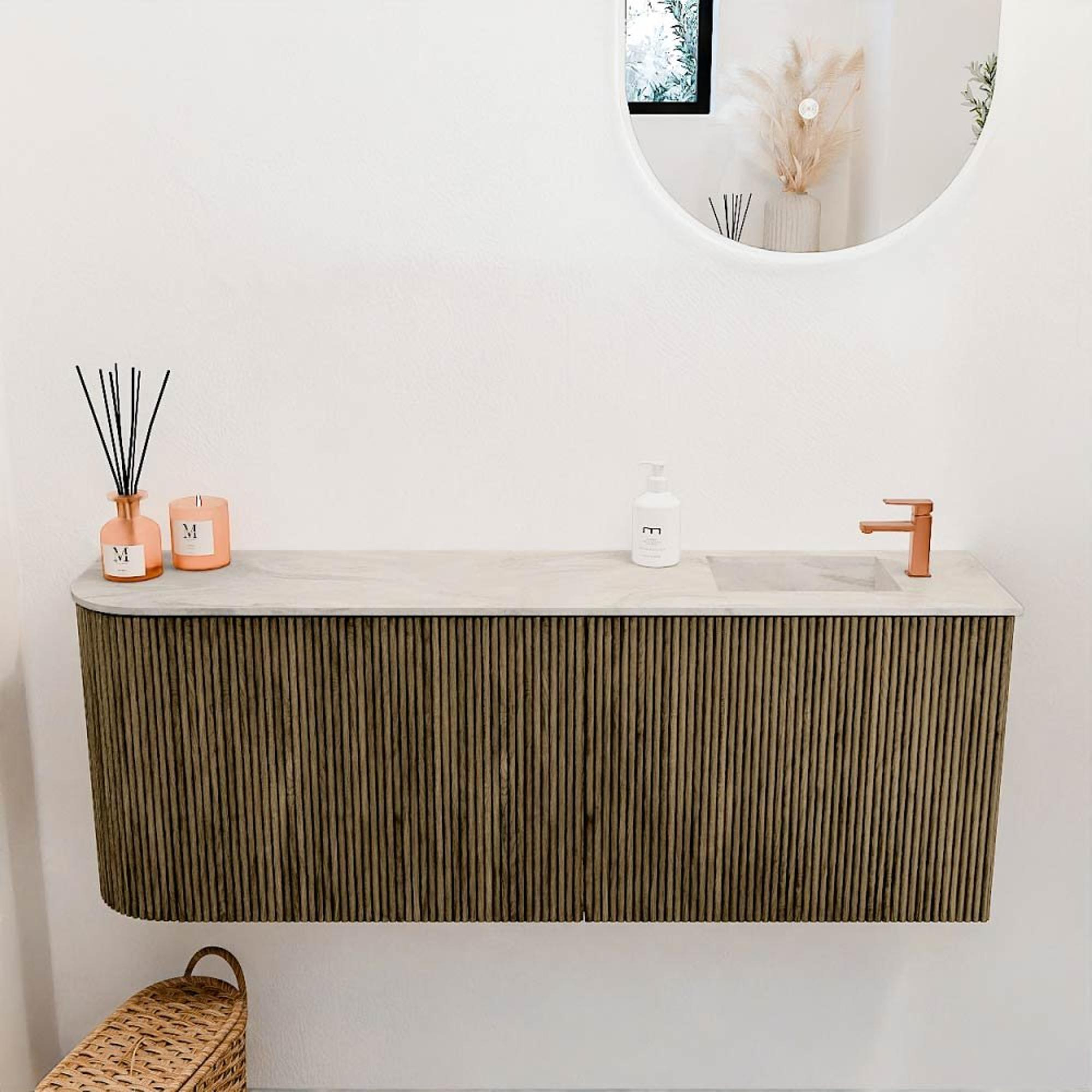 Het meubel valt direct op door zijn natuurlijke uitstraling, mede dankzij de combinatie van massief eiken fronten en eikenfineer aan de zijkanten. Deze hoogwaardige materialen geven het meubel een warme, authentieke uitstraling die perfect aansluit bij moderne en klassieke badkamers. De kleur Dusk voegt een subtiele diepte toe, waardoor het meubel een echte blikvanger wordt zonder te overheersen. Met de ronde vorm aan de linkerkant krijgt het geheel een uniek karakter dat jouw badkamer een persoonlijke en exclusieve sfeer geeft.