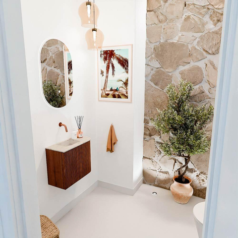 Ondanks het compacte formaat biedt dit meubel verrassend veel opbergruimte voor al je toiletartikelen. De wastafel is slim gepositioneerd aan de linkerkant, waardoor je optimaal gebruikmaakt van de beschikbare ruimte. Het ontbreken van een kraangat geeft je de vrijheid om zelf een kraan te kiezen die perfect aansluit bij jouw stijl en gebruiksgemak. Bovendien is het meubel eenvoudig aan de wand te monteren, wat zorgt voor een opgeruimde en luchtige uitstraling in je badkamer.