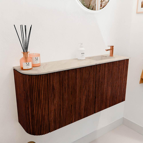 Met dit prachtige meubel geef je jouw badkamer of toiletruimte een unieke en warme uitstraling. De combinatie van de diepe robijnrode kleur met het zachte, lichte frappe van de wastafel zorgt voor een subtiel contrast dat direct in het oog springt. Dankzij de slimme ronding aan de linkerkant past dit meubel perfect in diverse ruimtes, ook waar de ruimte wat beperkter is. Het meubel is niet alleen een lust voor het oog, maar ook bijzonder praktisch. De wastafel met één kraangat aan de rechterzijde maakt het aansluiten van jouw favoriete kraan eenvoudig en zorgt voor een nette afwerking. Door de hoogwaardige materialen en de zorgvuldige afwerking geniet je jarenlang van een meubel dat niet alleen functioneel is, maar ook een echte blikvanger in je interieur.