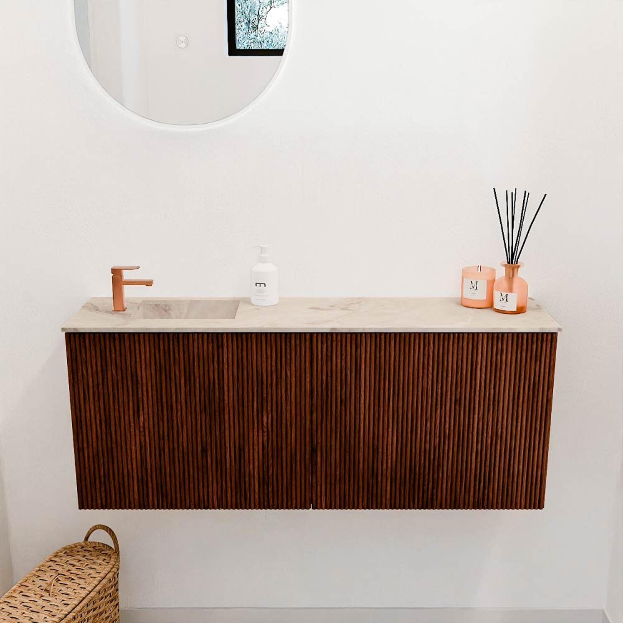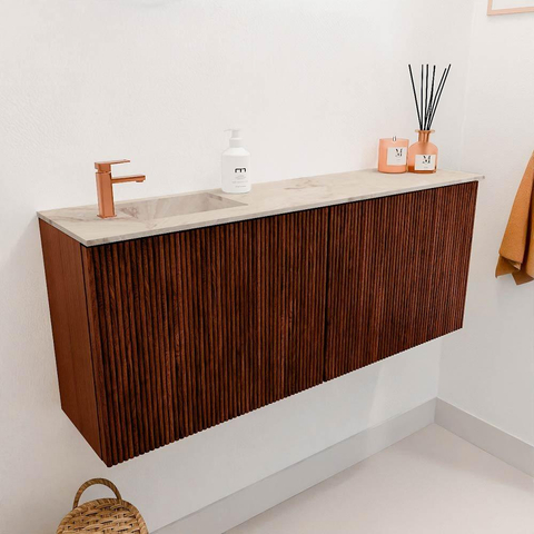 Het meubel is uitgevoerd in de warme kleur Ruby, die prachtig contrasteert met de beige marmeren uitstraling van de Frappe wastafel. De verticale ribbels in het hout zorgen voor een subtiele textuur die het geheel een exclusieve en moderne look geeft. Door de combinatie van natuurlijke materialen en een strak design past dit meubel perfect in zowel klassieke als eigentijdse badkamers. Zo creëer je een ruimte die niet alleen functioneel is, maar ook uitnodigt om te ontspannen en te genieten.
